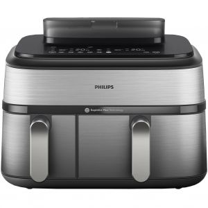 Мультипіч місткістю 9 л з 2 кошиками та функцією приготування на пару: знімна чаша на 6 л для основних страв, картоплі фрі та улюблених страв, а чаша на 3 л – для гарнірів та закусок. Вона вміщує до 1100 г картоплі фрі, 1600 г овочів або 12 курячих гомілок. У великий кошик поміститься ціла курка вагою 1,2 кг.