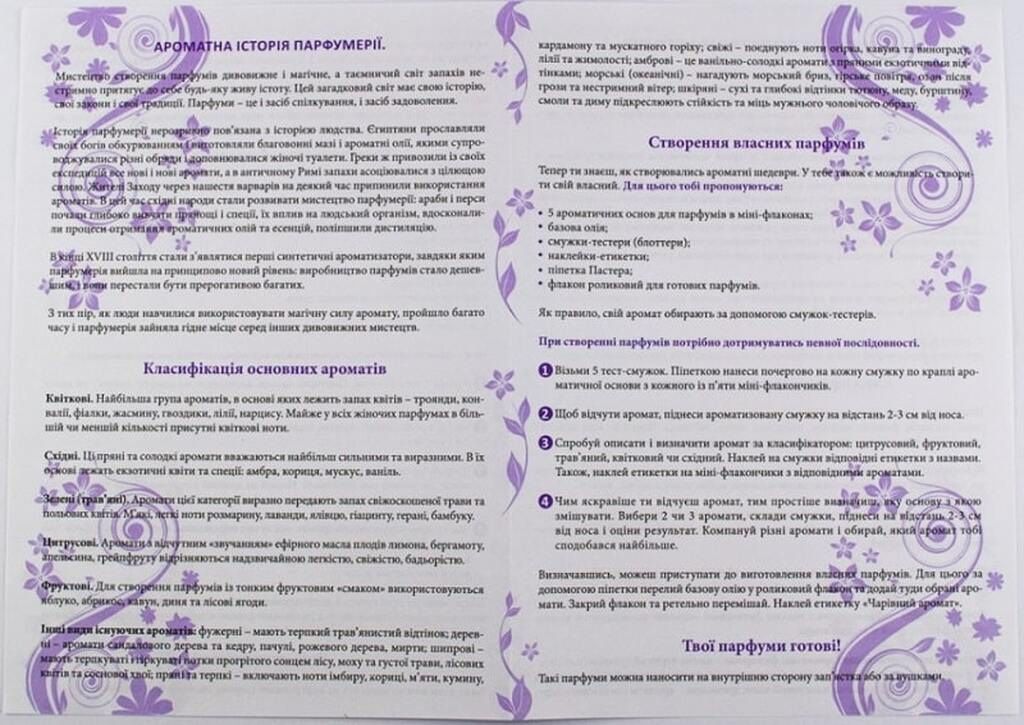 Науково-пізнавальний набір «Чарівний аромат» допоможе не тільки дізнатись історію парфумерії та класифікацію ароматів, а й створити свої власні парфуми.