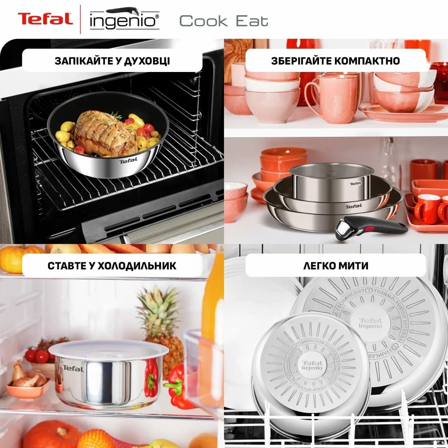 Набір посуду Tefal Ingenio Cook Eat L881S404 створений, щоб спростити ваше щоденне приготування їжі. Набір посуду Ingenio Cook Eat з нержавіючої сталі зі знімною ручкою забезпечує зручність користування щодня, легке очищення та компактне зберігання. Готуйте на плиті, ставте в духовку (без ручки) або просто зберігайте залишки страв у холодильнику — цей універсальний посуд заощаджує ваш час і енергію щодня.