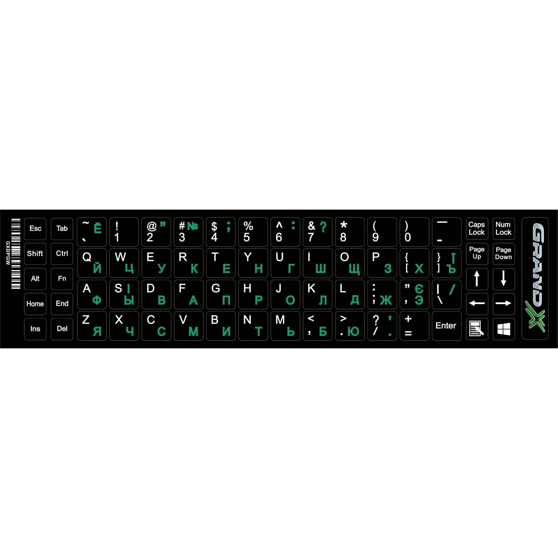 Наліпки на клавіатуру Grand-X 68 keys Cyrillic green, Latin white (GXDPGW)