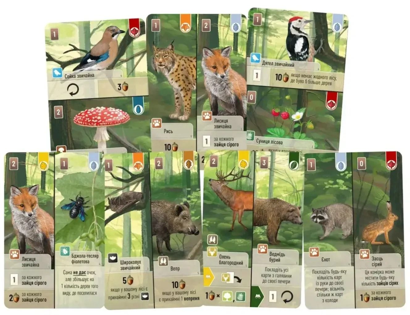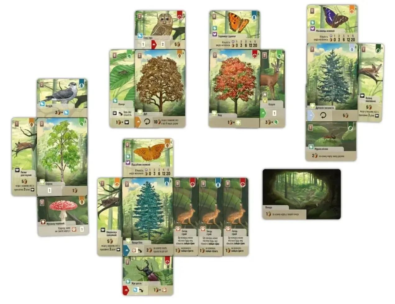 Карти дерев - це основа основ, з них все і буде починатися. Взагалі, їх є аж 8 різних типів, адже як середовище для життя різних тварин та рослин краще підходять різні дерева. А карти лісових жителів, якщо ви на них уважно поглянете, є не зовсім звичайними: вони розділені навпіл - горизонтально або вертикально. І, відповідно, викладаючи жителя до дерева, його потрібно розмістити так, щоб з-під карти виглядала тільки половинка дерева, яку ви хочете отримати. Ну і користь з цих карт звичайно є, й не тільки візуальна, хоча і це вагомий аргумент. Вони також приносять переможні очки та додаткові бонуси, такі як: ще один хід, добір карток тощо.