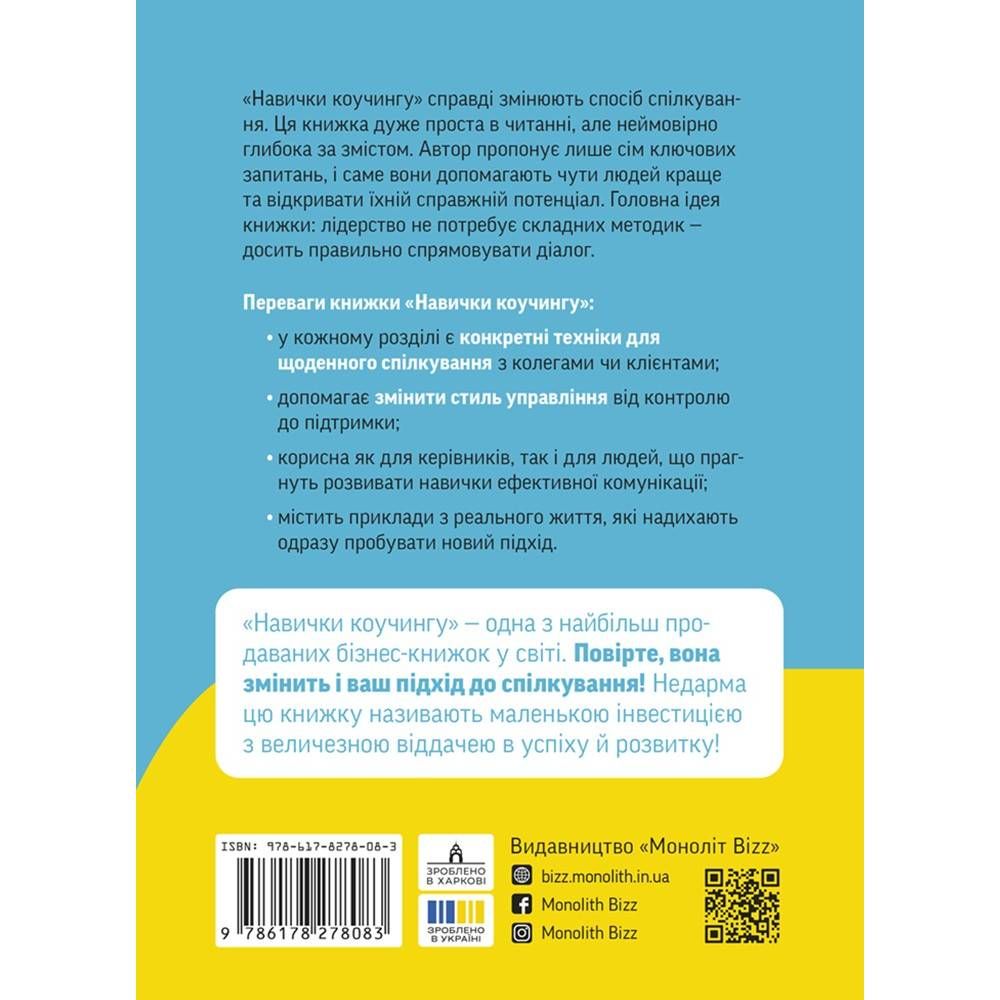 «Навички коучингу. Говоріть менше, питайте більше й назавжди змініть спосіб свого лідерства» — одна з найбільш продаваних бізнес-книг у світі. Повірте, вона змінить ваш підхід до спілкування! Не дарма цю книжку називають маленькою інвестицією з величезною віддачею в успіху і розвитку!