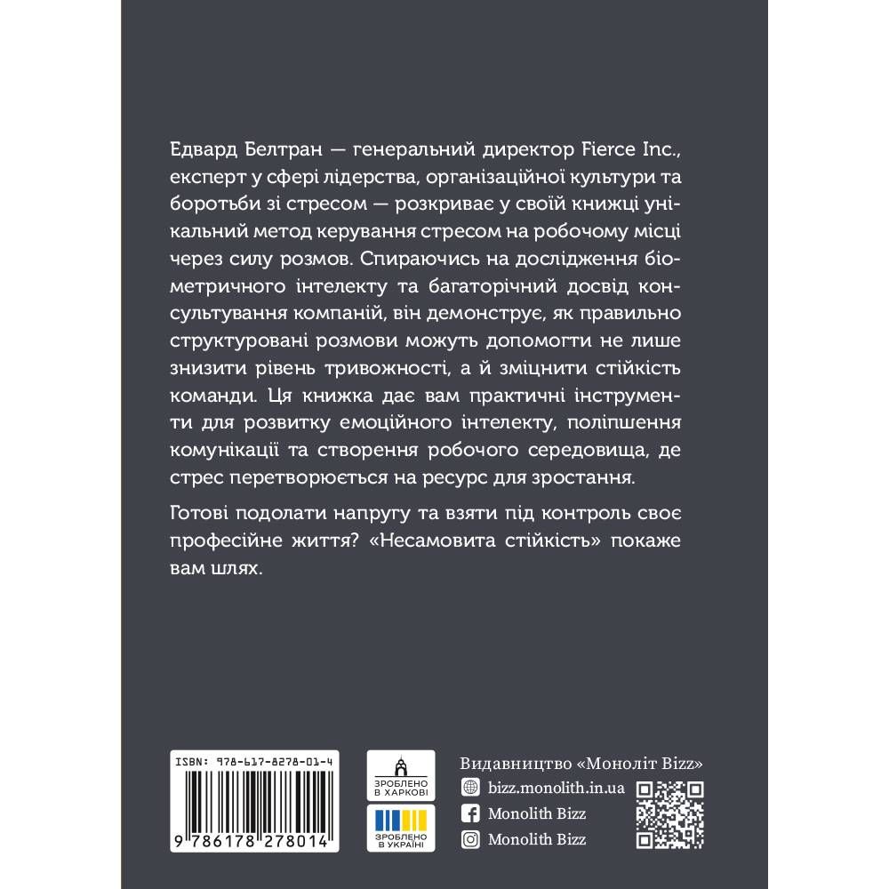 - Ця книжка надасть вам практичні інструменти для розвитку емоційного інтелекту, поліпшення комунікації та створення робочого середовища, де стрес перетворюється на ресурс для зростання.
