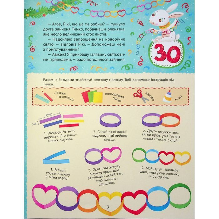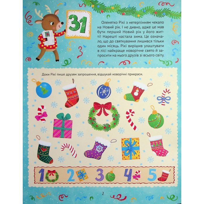 Читачі, які також отримали запрошення від Рікі, можуть виконати тридцять одне завдання. Компанія змайструє яскраву святкову гірлянду під керівництвом зайченя Тимка. Разом із білочкою Зірочкою прикрасить новорічну панчішку, а з котиком Пухнастиком напише Санті листа. Сова Мудрагеля знає багацько віршиків: вона розповість свої улюблені та попросить вивчити один напам’ять. Приготування до Нового року — весела робота, а коли навколо панує дружня атмосфера, то виконувати завдання ще цікавіше!