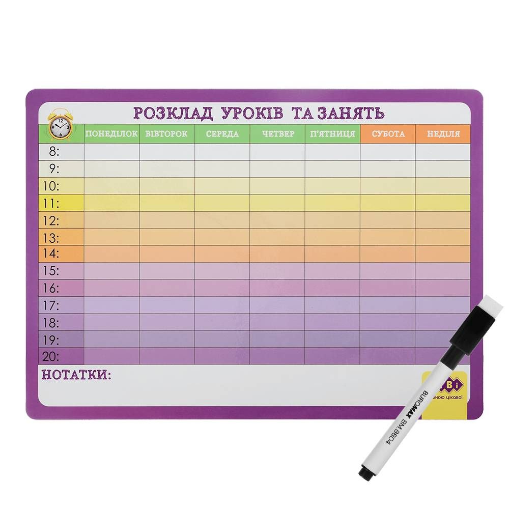 кольорова поверхня, має лініювання для запису розкладу занять та ін. заходів з 8 до 20 години на кожен день тижня, а також поле для фіксації додаткової інформації