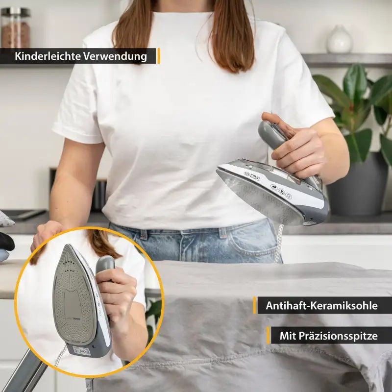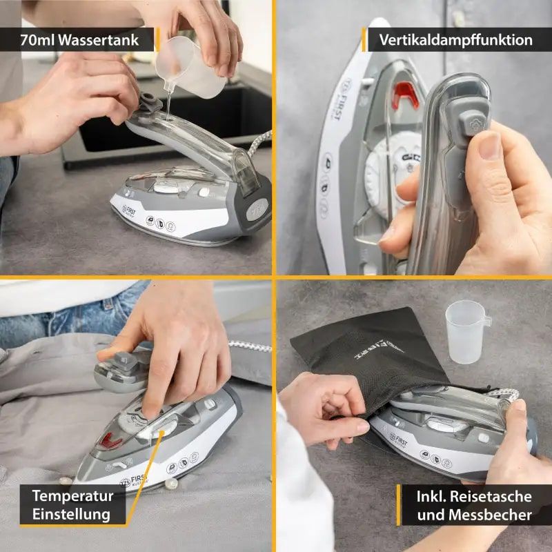 Дорожня праска TZS First Austria FA-5640-3 — це ідеальне рішення для тих, хто часто подорожує та цінує акуратний вигляд свого одягу. Ця компактна праска, яка важить всього 750 грамів, не займає багато місця у багажі завдяки складній ручці, що робить її максимально зручною для транспортування.