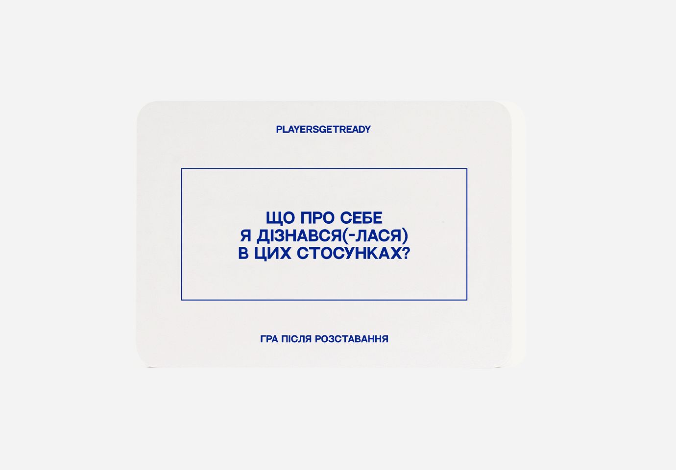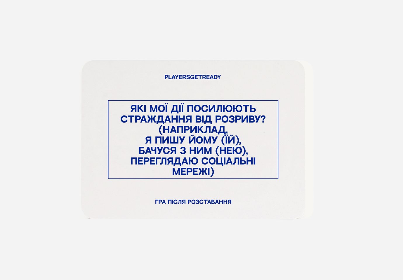 Психологічна гра після розставання — це 60 карток із запитаннями, задачами і підказками, розроблених психологом. Практична гра для тих, хто намагається пережити розставання. Вона складається із запитань, завдань та підказок для тих, хто проходить через непростий період розриву стосунків. Ця гра — провідник у нові, якісніші стосунки. Цього разу — із собою
