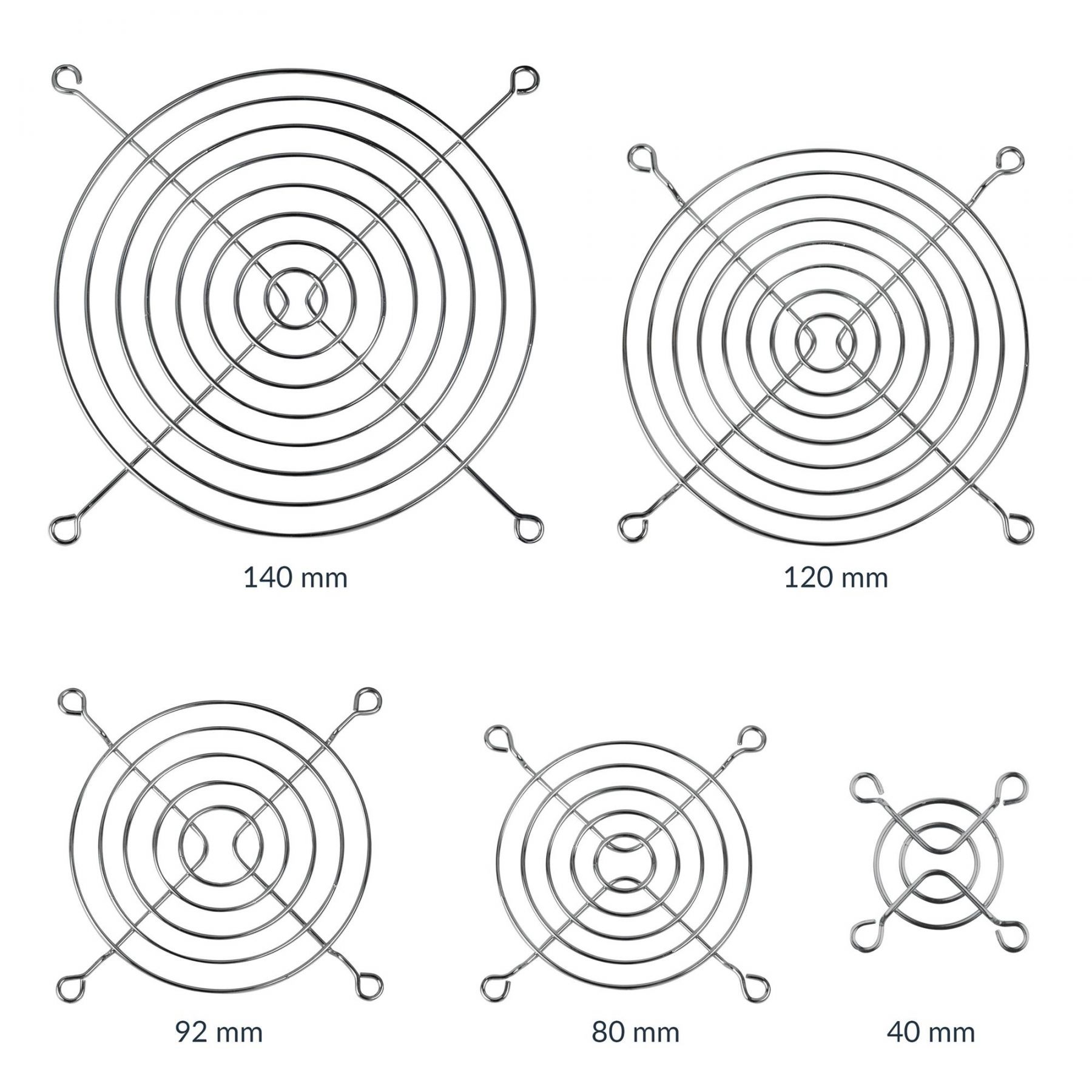 Наші вентиляторні решітки доступні в чотирьох різних розмірах: 40 мм, 80 мм, 92 мм, 120 мм і 140 мм.