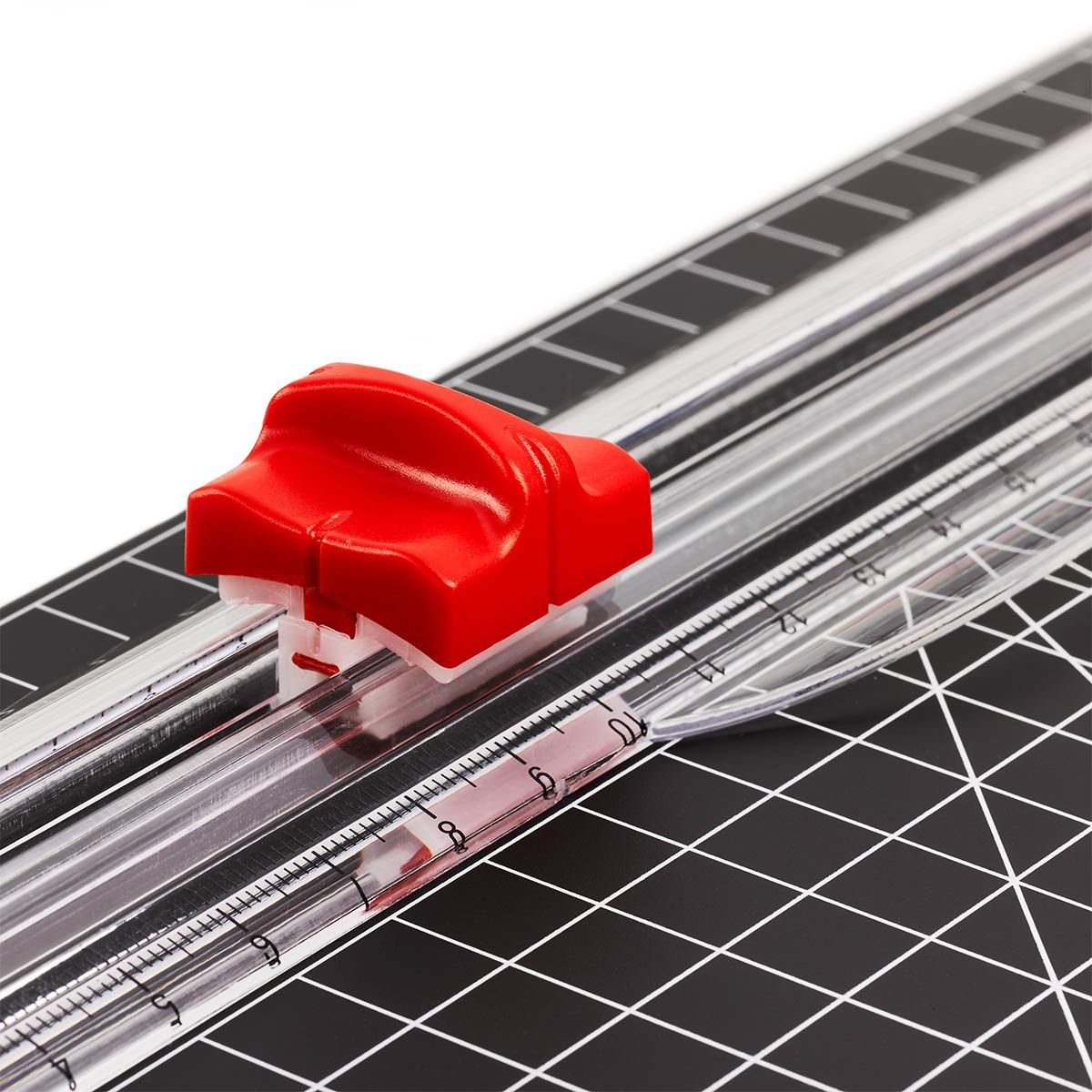 Оснащений відкидною напрямною лінійкою з кутовою (45°, 60°, 75°, 90°) та сантиметровою шкалою - для зручного позиціонування аркушів і точного різання під заданим кутом. Ручний притиск утримує папір під час роботи. Лезо забезпечує акуратний та чіткий зріз без пошкоджень країв.
