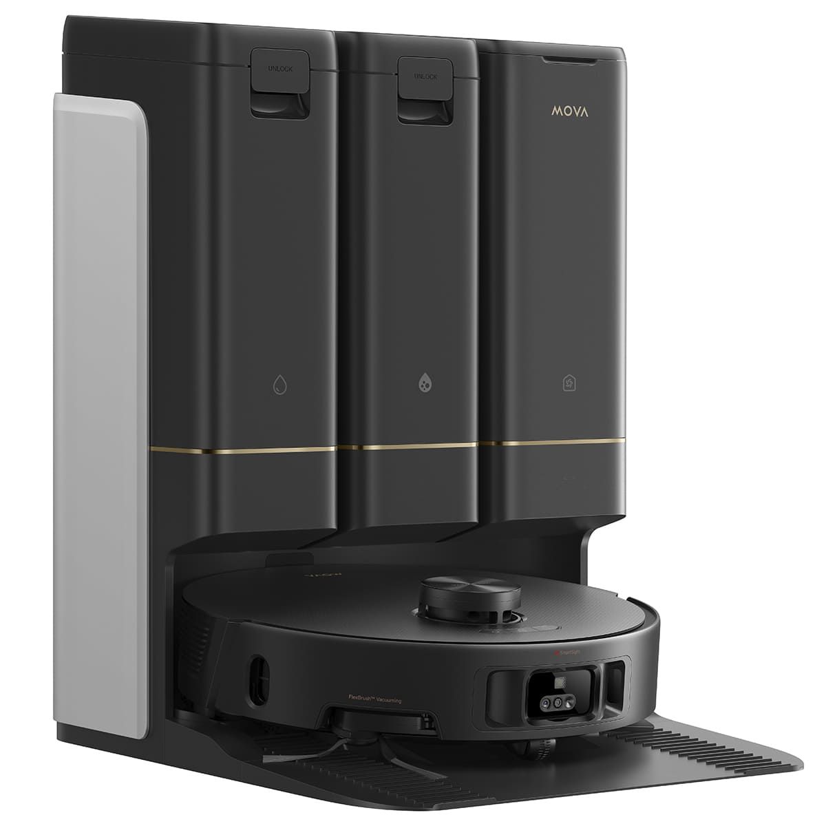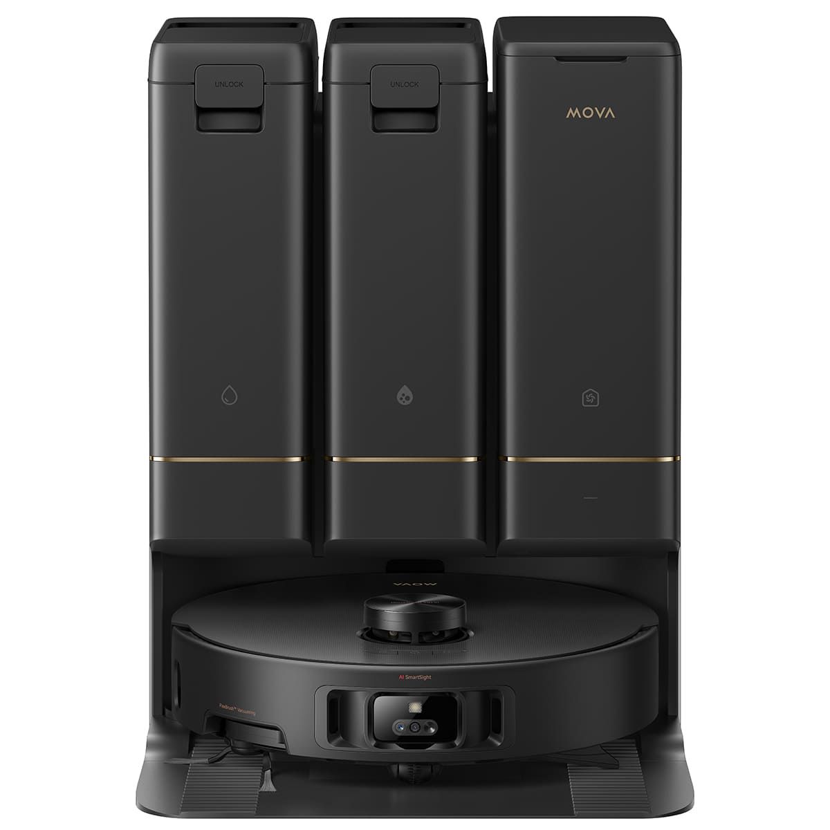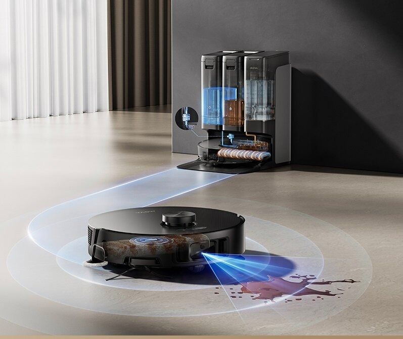 Trile-Intelligence AAI Sesnsig Tech: бінокулярні камери, робот-пилосос, базова станція працюють разом під керівництвом штучного інтелекту для ефективного та якісного прибирання, виявляючи забруднення, розподіляючи зони прибирання та коригуючи стратегії в реальному часі. Система відстежує стан швабри, автоматично промиваючи її на станції за потреби.