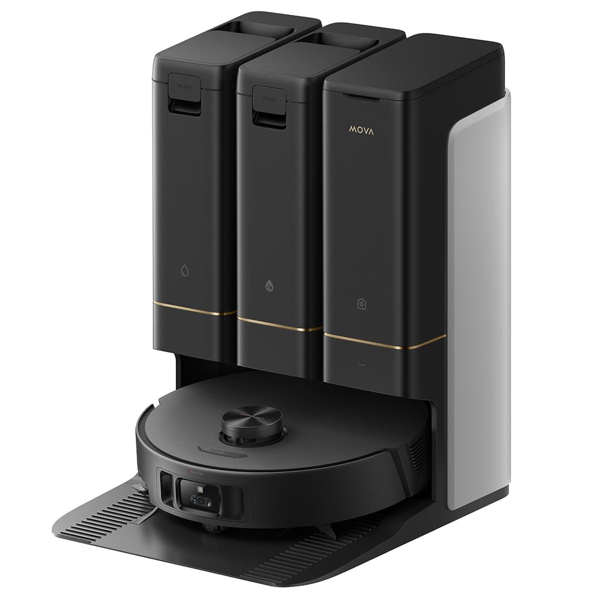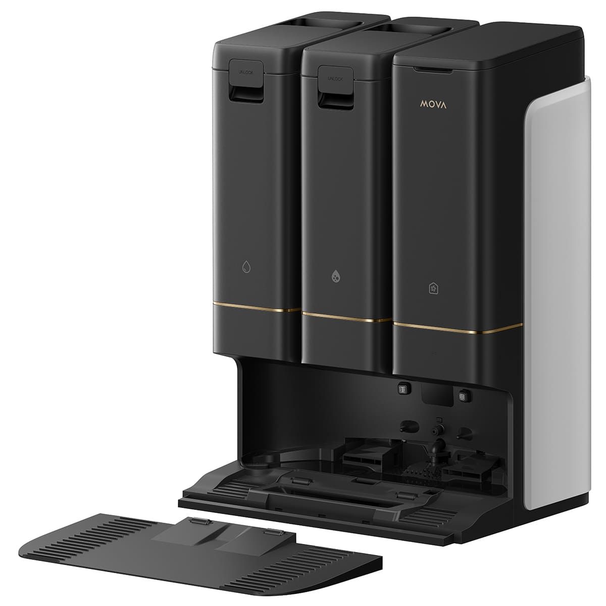Базова станція має зручну для використання конструкцію з 3 контейнерами, які автоматично додають і зливає воду, збирають пил і заправляють розчином для чищення, що знижує зусилля, необхідні для роботи. Після прибирання станція ретельно миє швабру гарячою водою за температури 75 градусів Цельсія. Пилозбірник об’ємом 4л гарантує, що використовувати робота-пилосос можна протягом 120 днів без обслуговування.