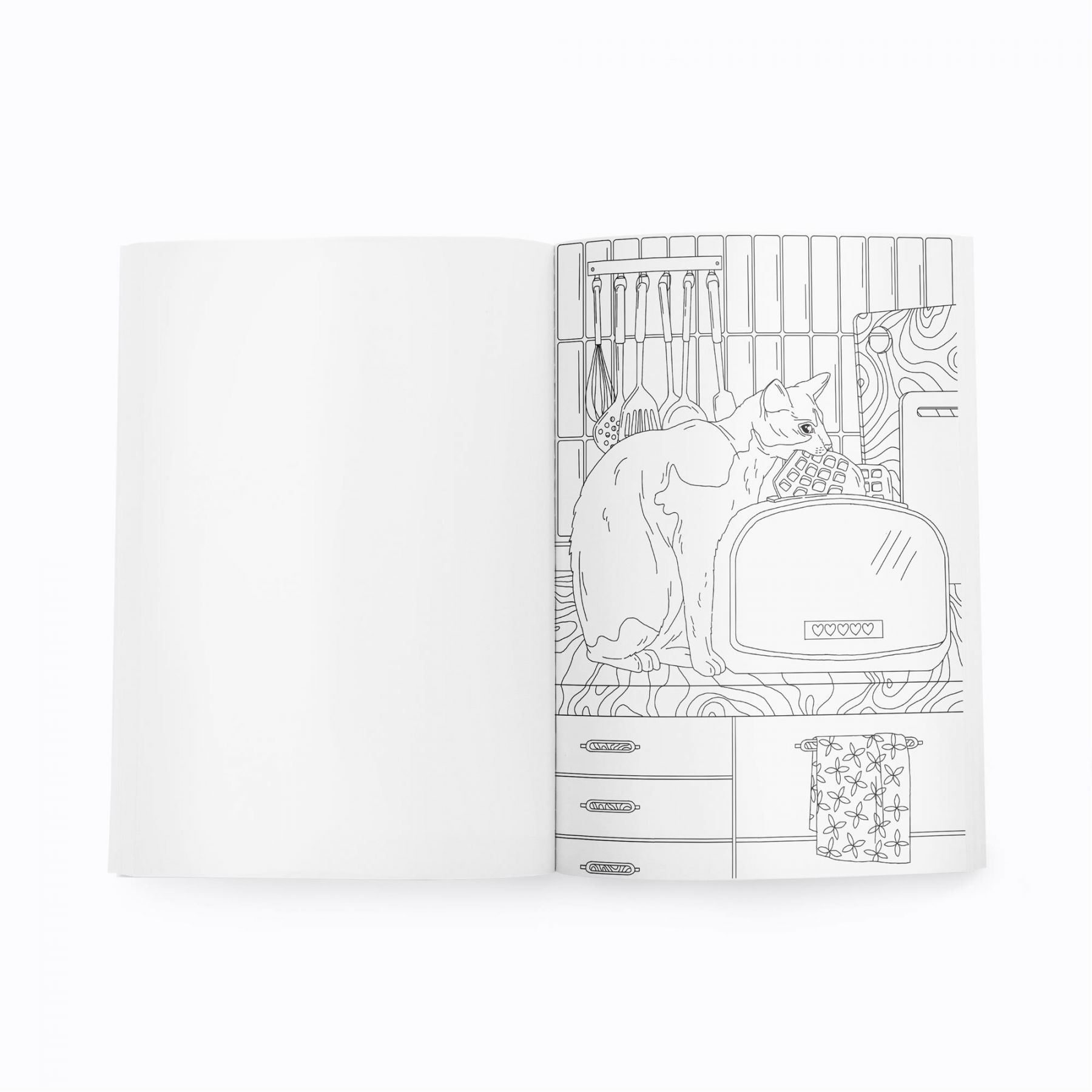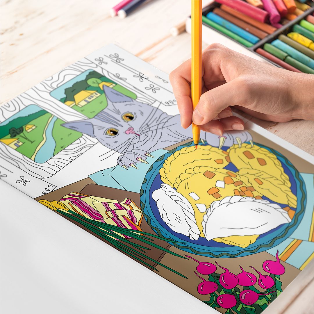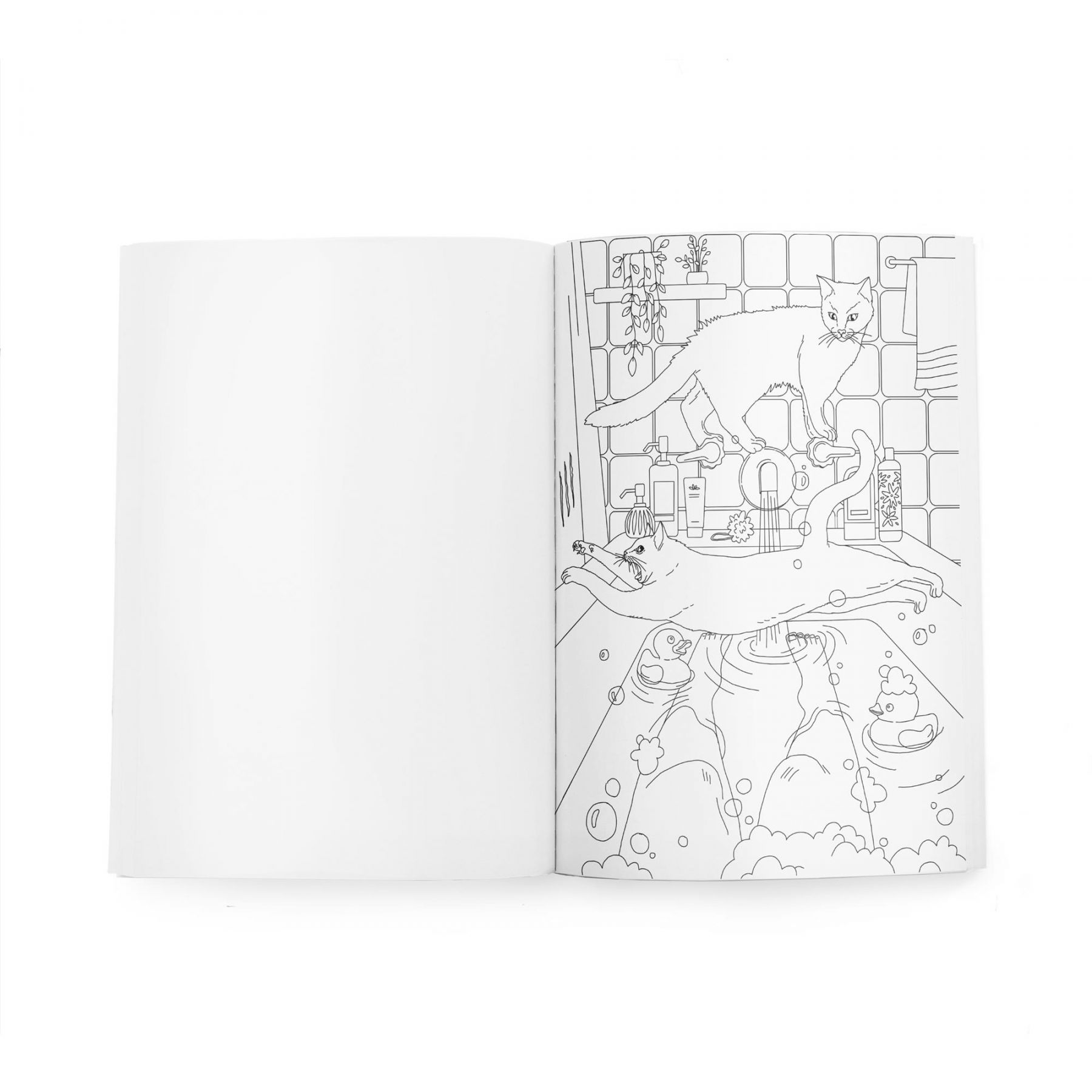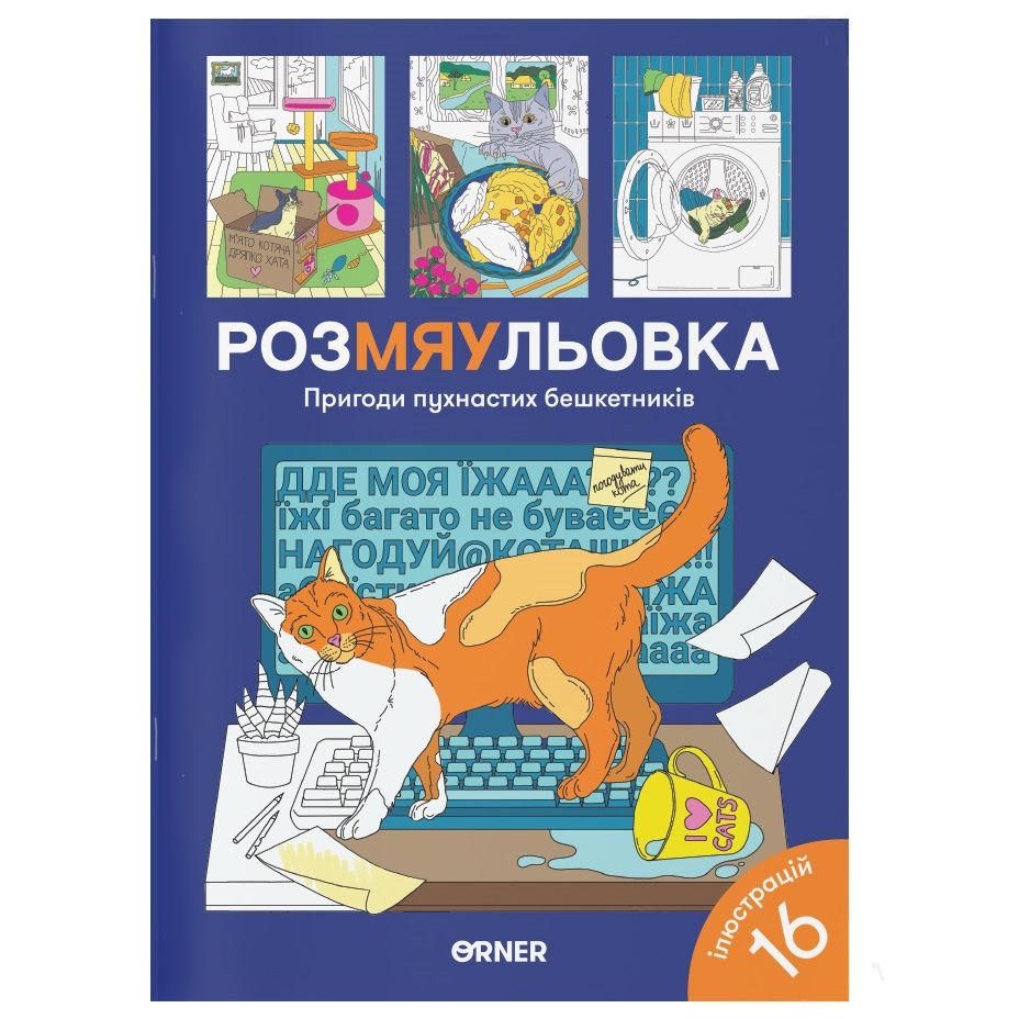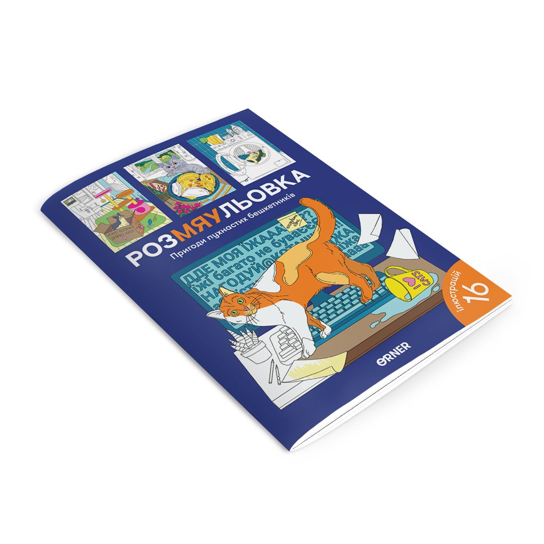 Розмальовка «Пригоди пухнастих бешкетників» — 16 ілюстрацій про те, чим наповнені неймовірно завантажені котячі будні. Розмальовуйте та шукайте знайомі сюжети.