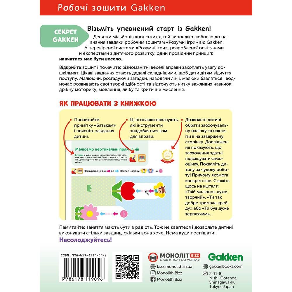 Підготовка до письма — важлива складова підготовки малюка до початкової школи. У віці від двох до чотирьох років робити це складно, але можливо. Саме на це націлена книжка «Gakken. Розумні ігри. Підготовка до письма. 2-4 роки». Вона входить до серії книжок «Розумні ігри», що забезпечує дітей комплексними знаннями та навичками та сприяє гармонійному розвитку малечі в цілому.
