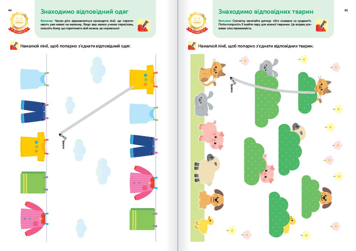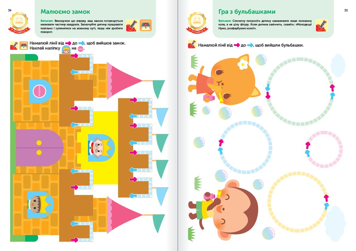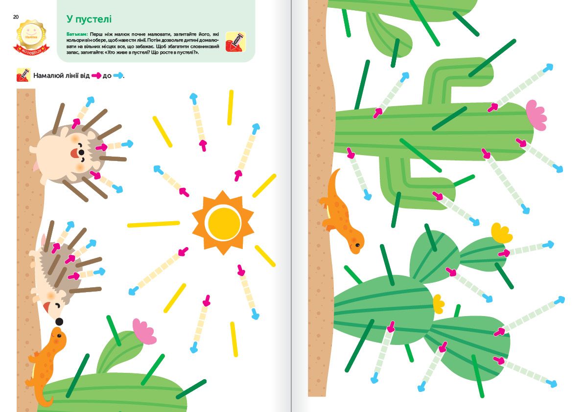 Виконуючи веселі вправи, з яких складається книжка, малюк бавитиметься і водночас вчитиметься правильно тримати ручку, олівець, пастельну крейду та маніпулювати ними.