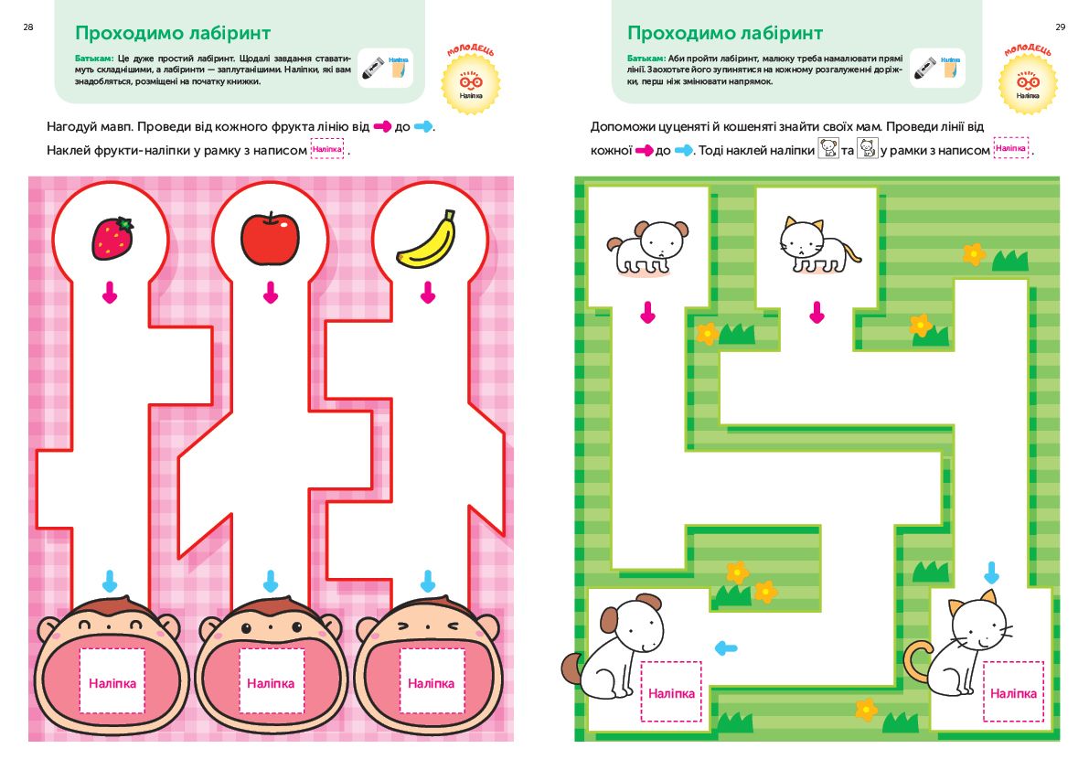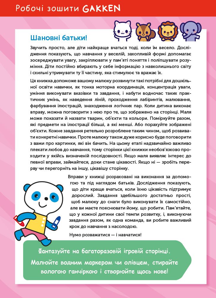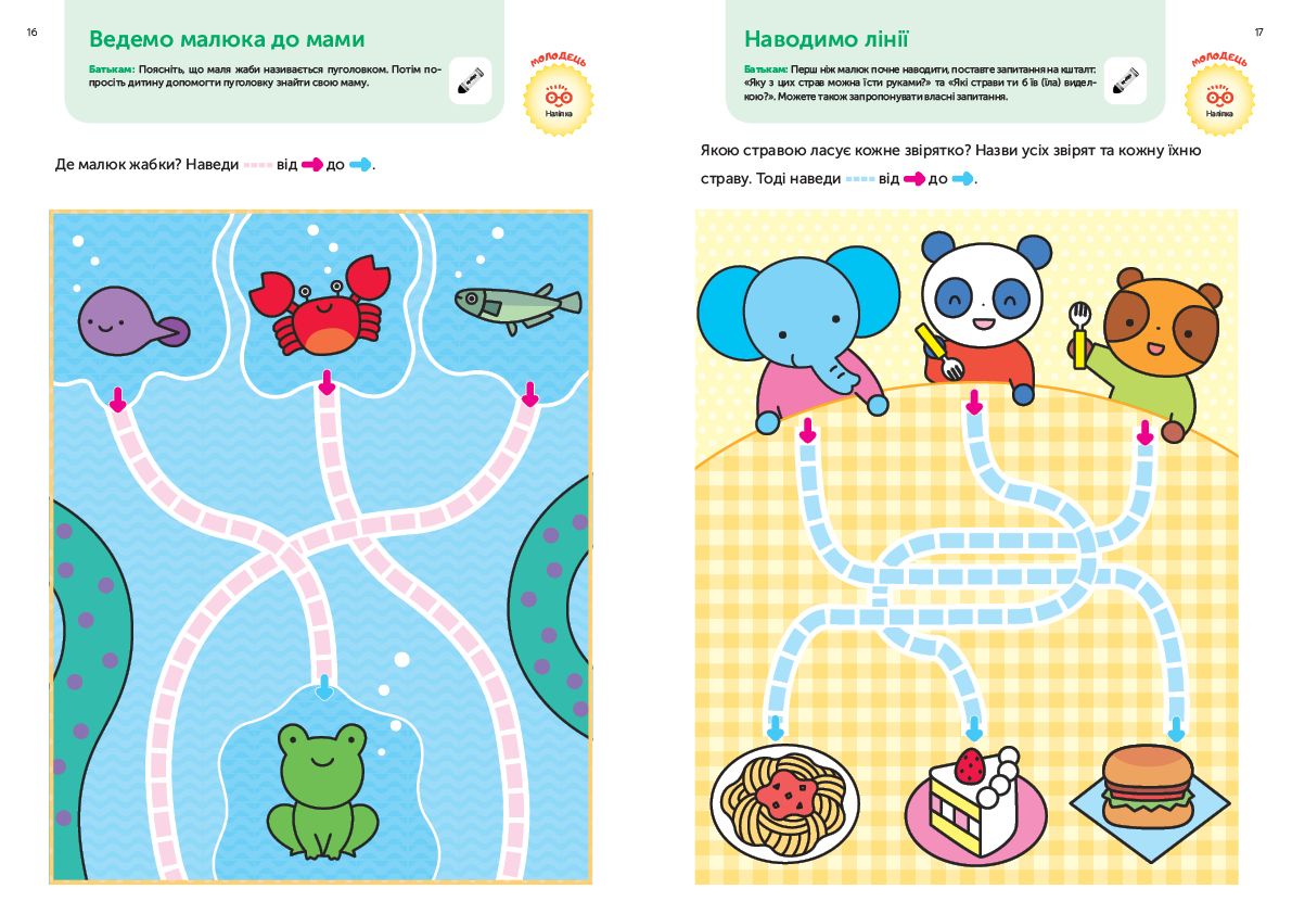 Книжка розвиває базові навички малюка віком від двох до чотирьох років. Тут дитина вчиться наводити лінії та обводити контури, проходити лабіринти, малювати та розфарбовувати ілюстрації, знаходити логічні пари.
