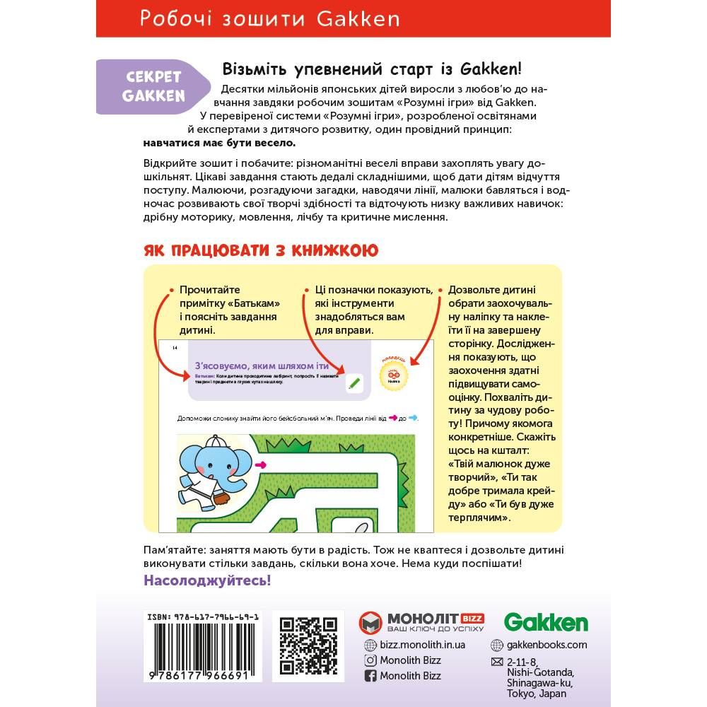 Книжка є важливим компонентом серії видань «Розумні ігри», що готують дітей до початкової школи. Основна увага у цьому зошиті надається завданням на розвиток дрібної моторики, уміння розв’язувати проблеми та зосереджуватися.