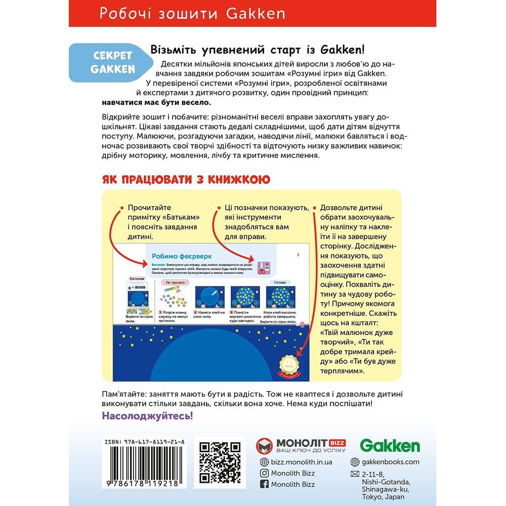 Вирізання та наклеювання — важлива складова підготовки малюка до початкової школи. У віці від двох до чотирьох років робити це складно, але можливо. Саме на це націлена книжка «Gakken. Розумні ігри. Розвиток креативності. 3-5 років». Вона входить до серії книжок «Розумні ігри», що забезпечує дітей комплексними знаннями та навичками та сприяє гармонійному розвитку малечі в цілому.