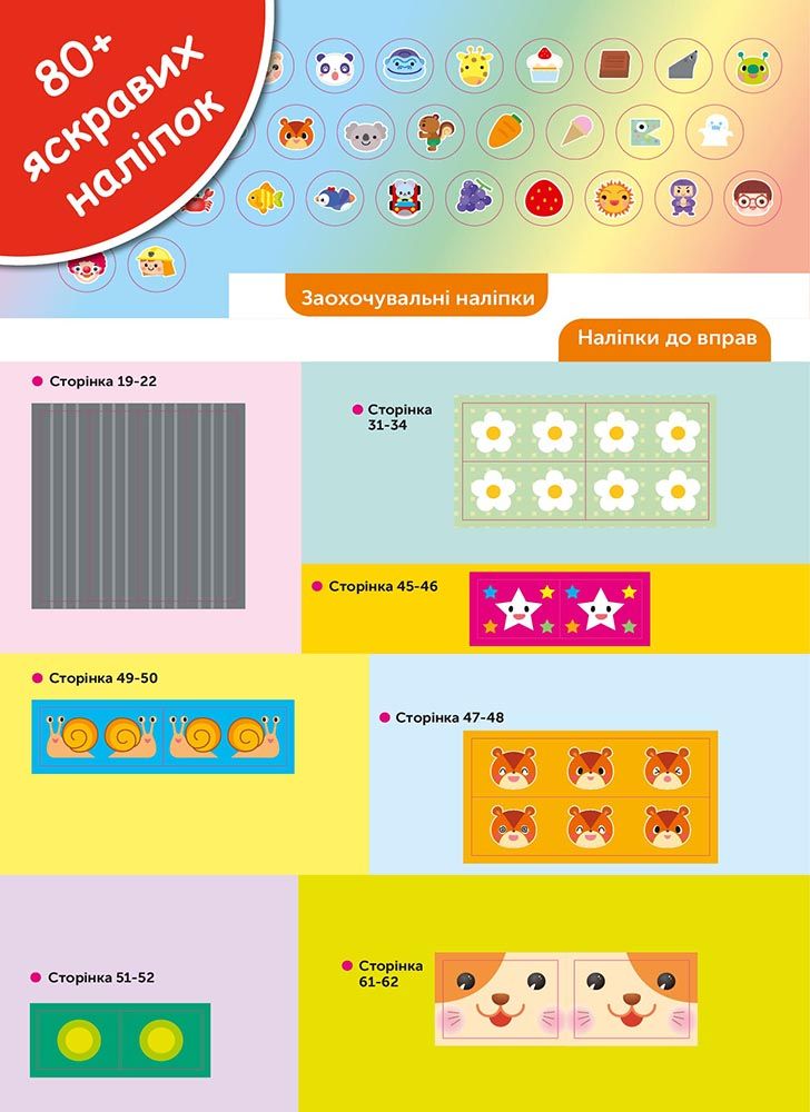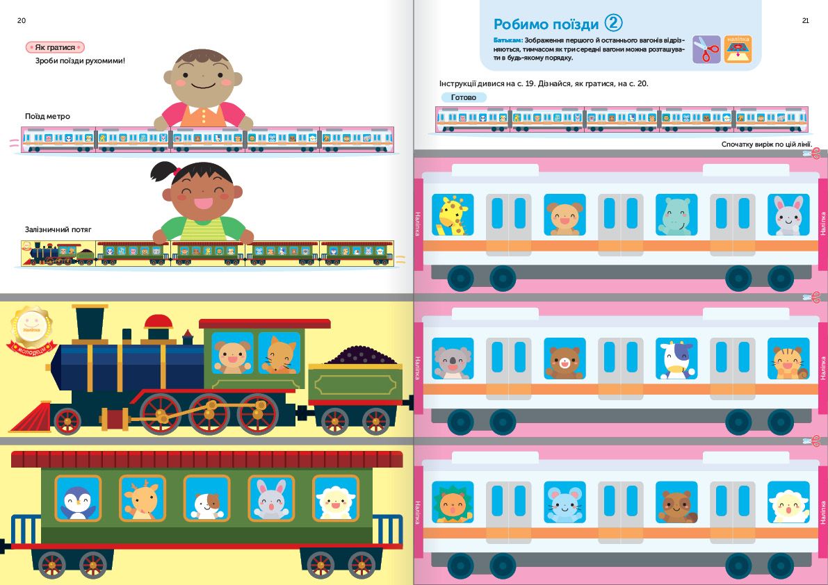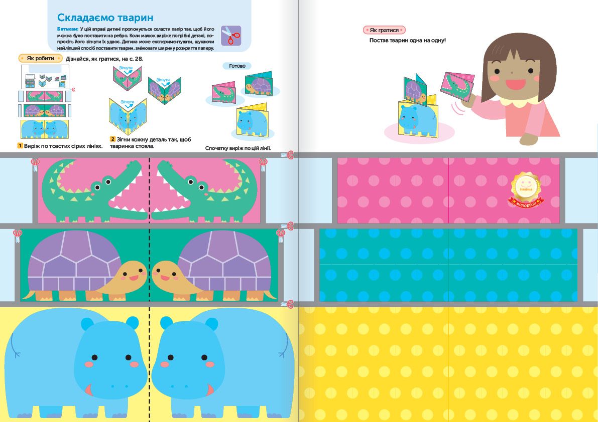 Виконуючи веселі вправи, з яких складається книжка, малюк бавитиметься і водночас вчитиметься правильно тримати ножиці, клей-олівець та маніпулювати ними.