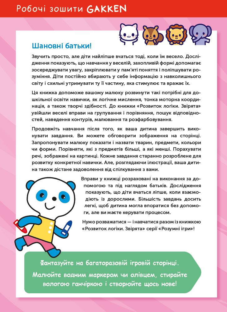 Розвиток логіки — важлива складова підготовки малюка до початкової школи. У віці від двох до чотирьох років робити це складно, але можливо. Саме на це націлена книжка «Gakken. Розумні ігри. Розвиток логіки. Звірята. 2-4 роки».