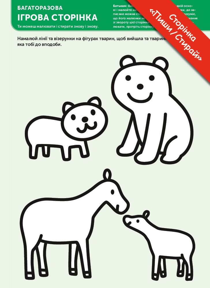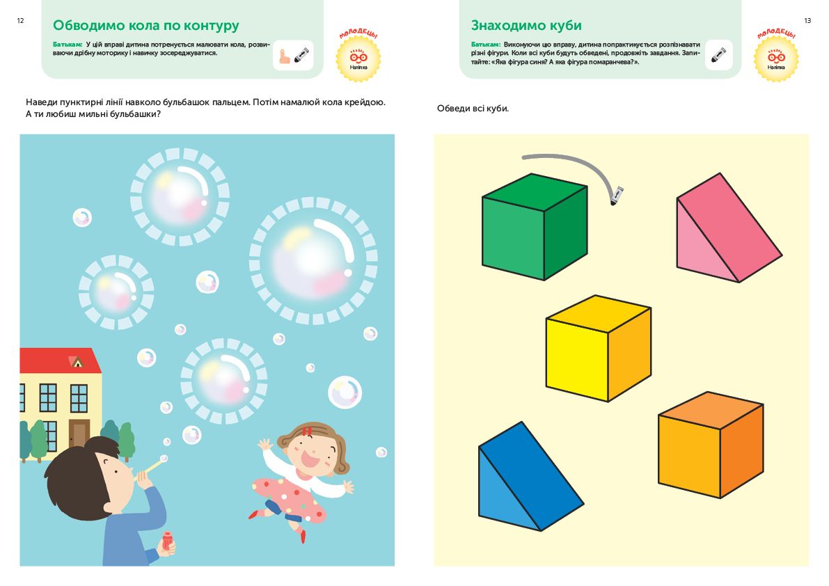 Ця книжка допоможе вашому малюку розвинути дрібну моторику, координацію рухів, а також такі потрібні для дошкільної освіти уміння та навички, як розфарбовування й розпізнавання фігур, зіставлення кольорів і наведення контурів, порівняння предметів і пошук відмінностей.