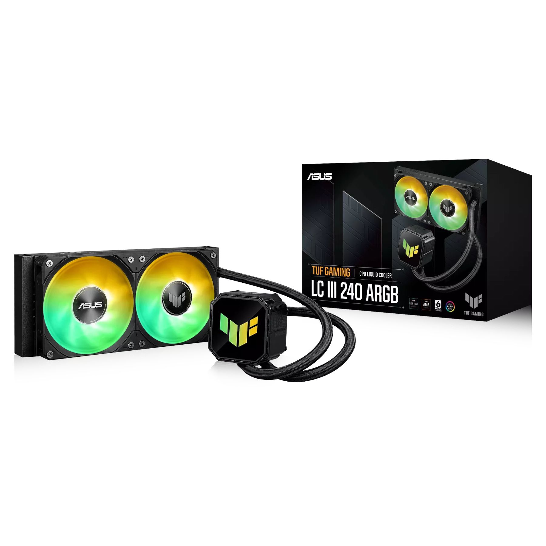 TUF Gaming LC III 240 ARGB – необслуговувана рідинна система охолодження процесора з двома попередньо встановленими вентиляторами для створення високого повітряного потоку й статичного тиску та високоефективною помпою, що забезпечує оптимальну робочу температуру процесора.