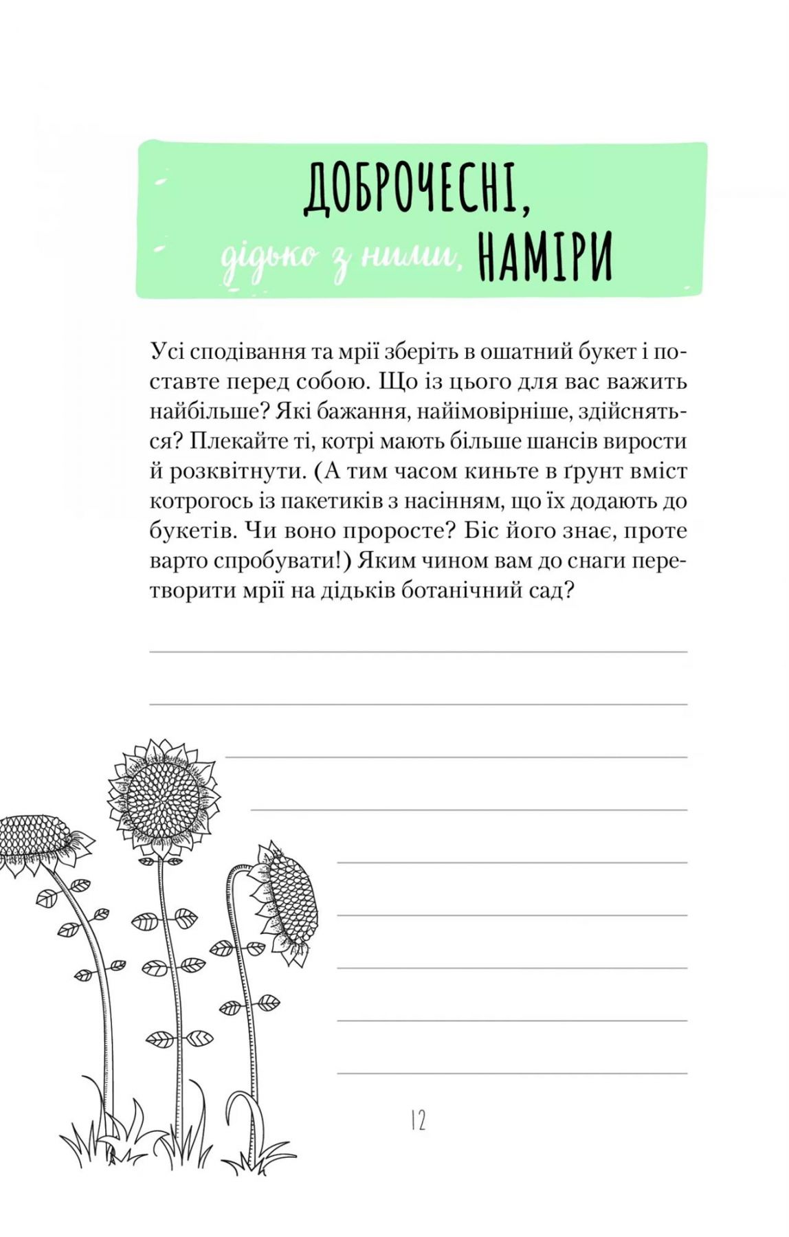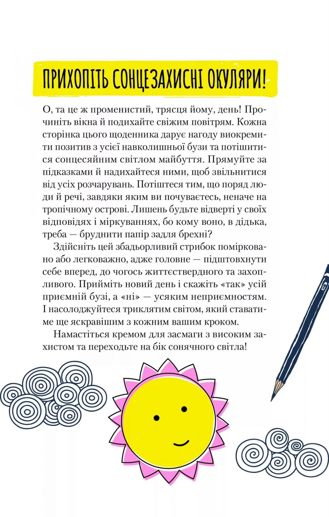 Анотація: О, та це ж променистий, трясця йому, день! Прочиніть вікна й подихайте свіжим повітрям. Кожна сторінка цього щоденника дарує нагоду виокремити позитив з усієї навколишньої бузи та потішитися сонцесяйним світлом майбуття. Прямуйте за підказками й надихайтеся ними, щоб звільнитися від усіх розчарувань. Потіштеся тим, що поряд люди й речі, завдяки яким ви почуваєтесь, неначе на тропічному острові. Лишень будьте відверті у своїх відповідях і міркуваннях, бо кому воно, в дідька, треба — бруднити папір задля брехні?Здійсніть цей збадьорливий стрибок помірковано або легковажно, адже головне —підштовхнути себе вперед, до чогось життєствердного та захопливого. Прийміть новий день і скажіть «так» усій приємній бузі, а «ні» — усяким неприємностям. І насолоджуйтеся триклятим світом, який ставатиме ще яскравішим з кожним вашим кроком.