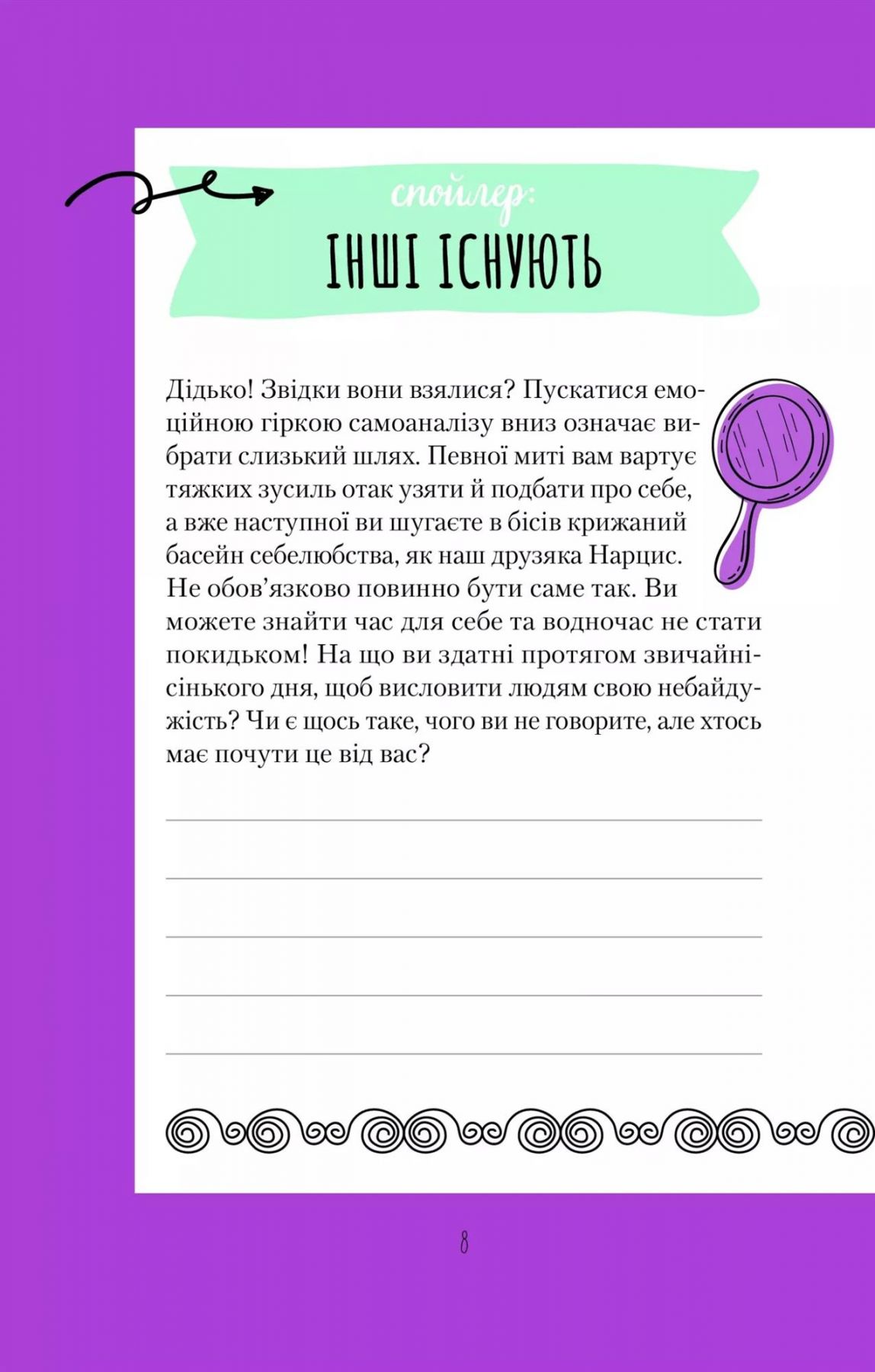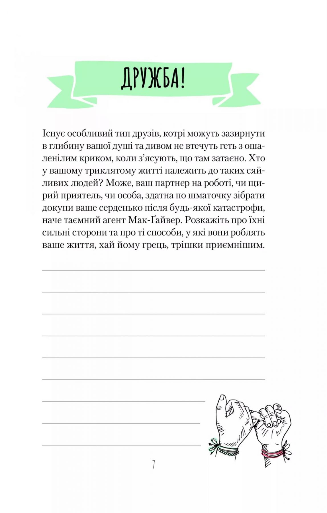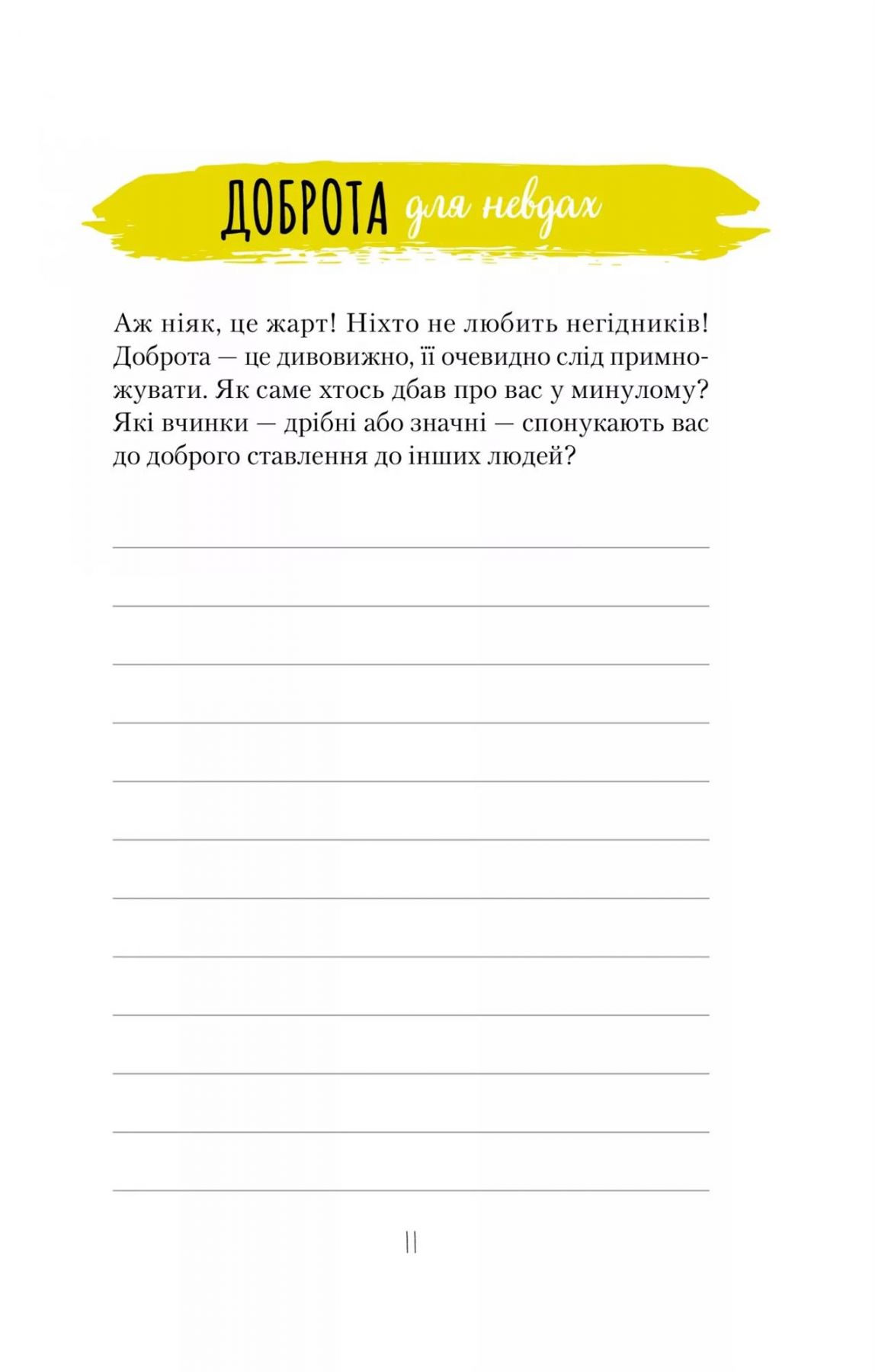 Крізь різноманітні питання й поради текст вчить фіксації позитивних моментів життя з неперевершеним іронічно-відвертим гумором. Нотатник стане неоціненним супутником подорожжю впровадження щоденної звички саморефлексії в оновлену рутину.