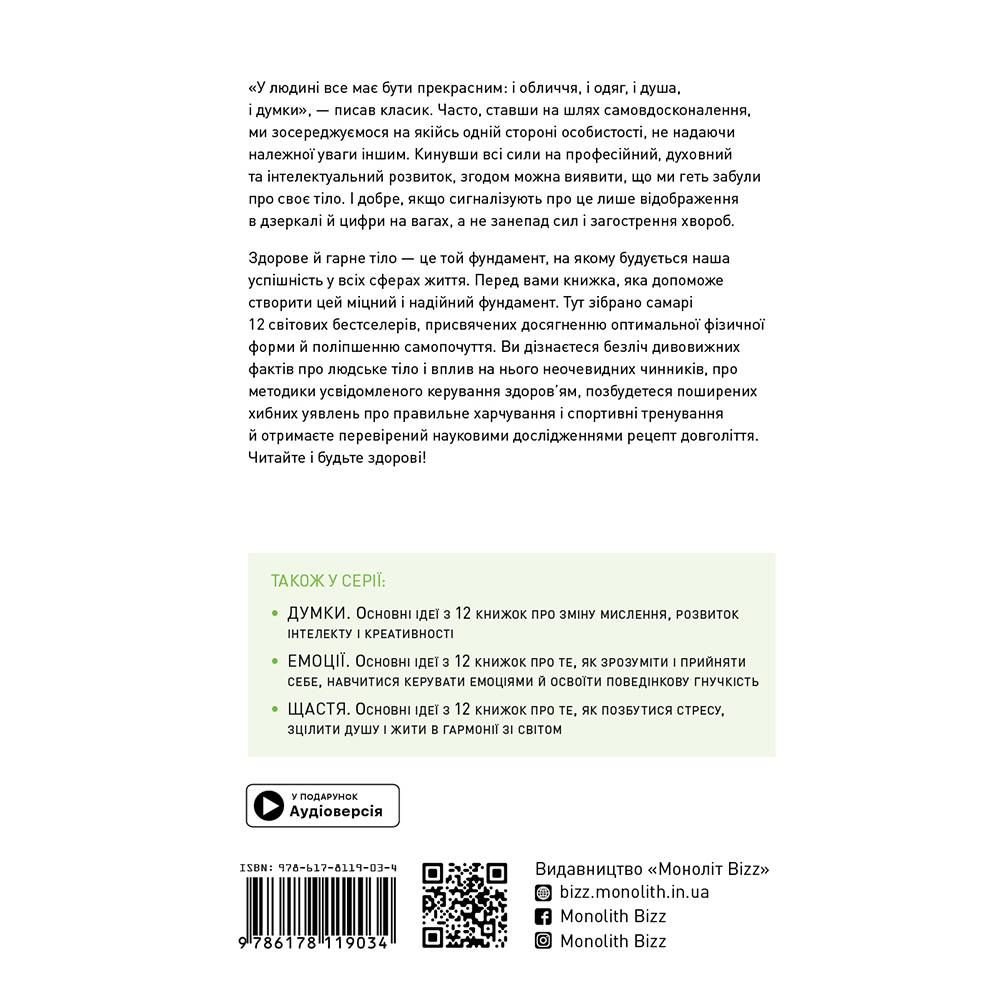 Здорове і гарне тіло — це той фундамент, на якому будується наше благополуччя у всіх сферах життя. Перед вами книжка, яка допоможе створити цей міцний і надійний фундамент. Тут зібрані саммарі 12 світових бестселерів, присвячених досягненню оптимальної фізичної форми і поліпшенню самопочуття. Ви дізнаєтеся силу-силенну цікавих фактів про будову власного тіла і зрозумієте, як примножувати, а не руйнувати подарований природою потенціал, і зможете раз і назавжди змінити свій спосіб життя.