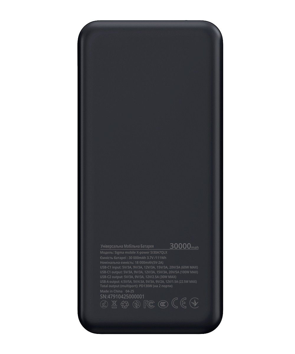 SI30A7QLX PD130W — унікальна новинка із оновленого модельного ряду павербанків від відомого українського бренду Sigma mobile. Це потужний і сучасний павербанк ємністю 30 000 мА·г із максимальною вихідною потужністю до 130 Вт.