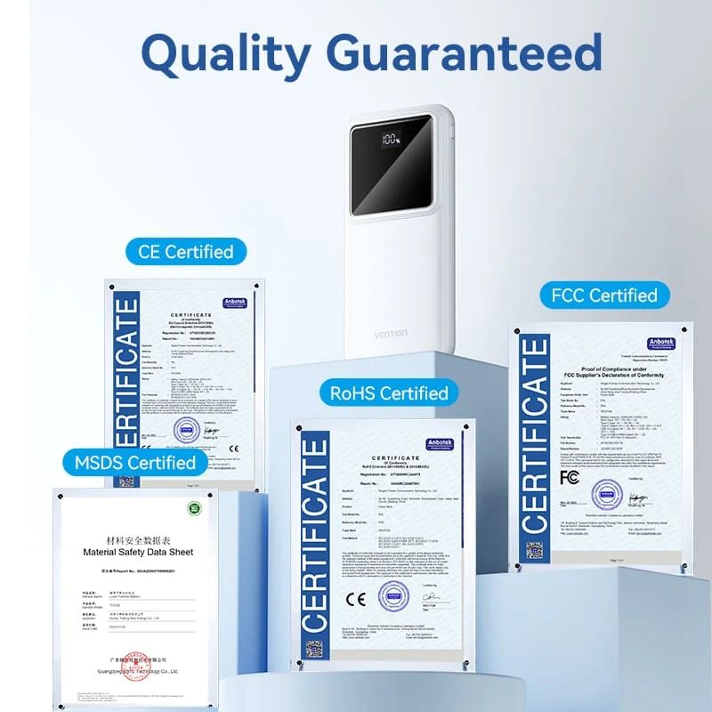Вбудований захист від перевантаження за струмом, перенапруги, перезарядки, перерозрядки, перегріву та короткого замикання робить батарею Vention 10000mAh 22.5W безпечною для вас і ваших пристроїв.