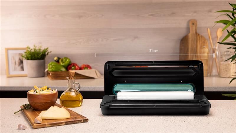 Ширина нагрівальної стрічки становить 31 см. Такий розмір дає змогу упаковувати одразу кілька продуктів. Заощаджуйте час, обирайте необхідний розмір пакета та отримуйте професійне пакування.