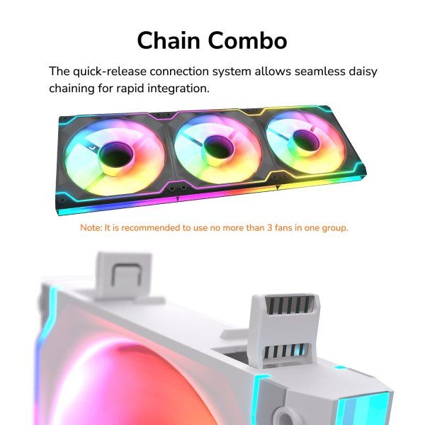 Система швидкороз’ємних з’єднань дозволяє здійснювати безшовне послідовне підключення для швидкої інтеграції, гарантуючи оптимальну ефективність повітряного потоку: швидка проста збірка без інструментів, яка дозволяє підтримувати охолодження вашої системи без зайвого клопоту. (Рекомендована конфігурація через ваші обмеження з джерелами живлення - не більше 3 вентиляторів)