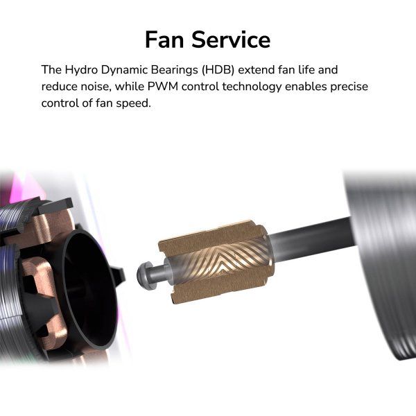 Гідродинамічні підшипники (HDB) подовжують термін служби вентилятора та знижують рівень шуму, а технологія управління ШІМ забезпечує точний контроль швидкості обертання вентилятора.