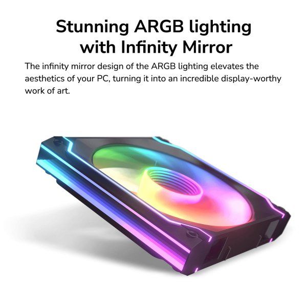 Модульні вентилятори – це шлях у майбутнє: система швидкороз’ємних з’єднань забезпечує просте послідовне з’єднання для швидкої та безпроблемної збірки. Покращені канали повітряного потоку підвищують ефективність та знижують шум за рахунок поділу повітряного потоку на мінімальні потоки. Конструкція нескінченного дзеркала забезпечує динамічні ефекти підсвічування, доповнені світлодіодним оздобленням, що створює безперервний контур.
