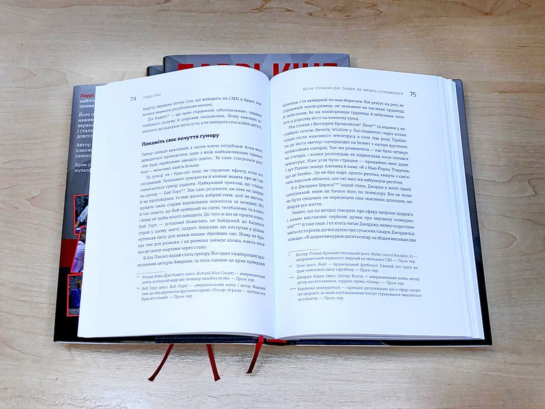 Ця книжка захоплює з першої сторінки, бо читаєш і віриш авторові, який за роки своєї журналістської кар’єри провів понад 60 тисяч інтерв’ю. Його співрозмовниками на мегапопулярному ток-шоу «Ларрі Кінг наживо» були Білл Клінтон, Дональд Трамп, Френк Сінатра, Арнольд Шварценеґґер та інші знаменитості світового масштабу. А у своїй книжці відомий телеведучий щиро, без пафосу, веде розмову з усіма нами, розкриваючи секрети власної успішності й даючи професійні поради на всі випадки життя: від сімейних свят і світських вечірок до жалобних заходів.