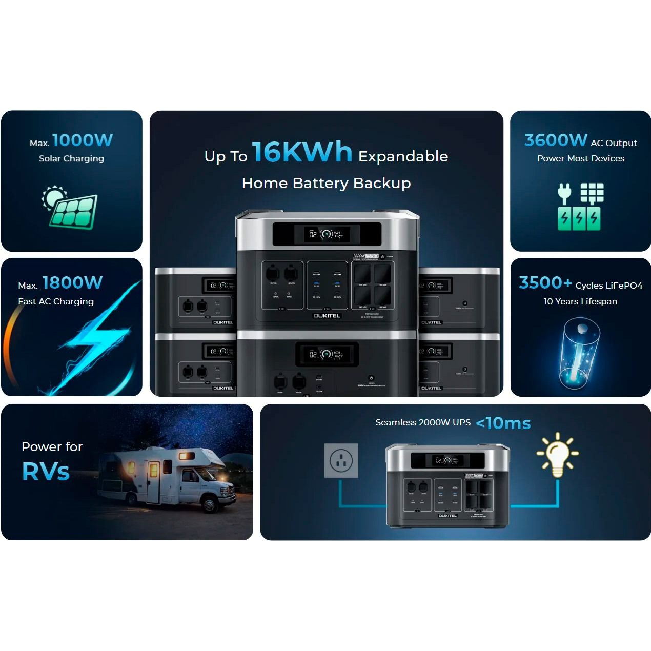 Об’єднайте BP2000 Pro з 7 батареями розширення B2000 паралельно, щоб досягти 16 кВт/год, що може забезпечити живлення протягом 1-6 днів під час перебоїв з електрикою. Ідеально підходить для домашнього резервного живлення, караванів, подорожей на природі або навіть повсякденного використання.