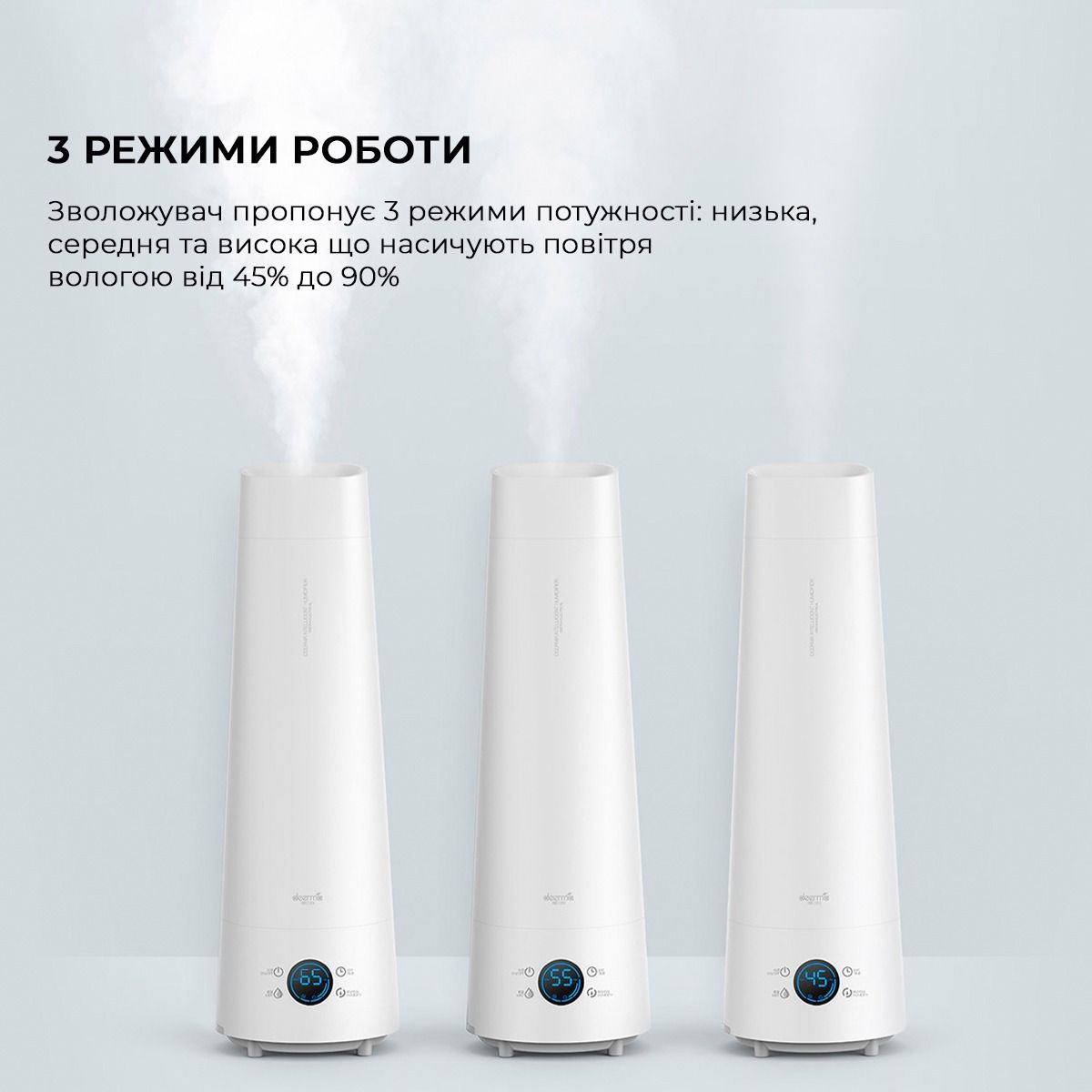 Для вибору оптимального рівня вологості, в DEERMA DEM-LD220 передбачено 3 робочих режими, які ви можете активувати на свій розсуд. Якщо в жаркий літній день, ви хочете повернутися в зволожене приміщення, просто залийте води в резервуар зволожувача, і встановіть таймер.