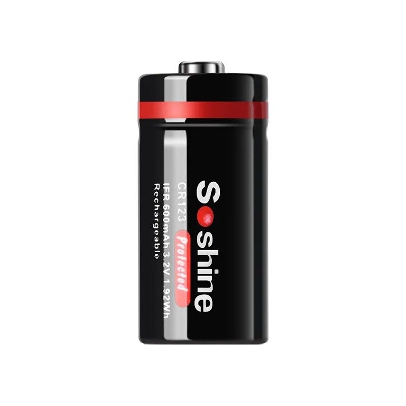 Циліндричний Літій-залізо-фосфатний (LiFePO4) акумулятор Soshine RCR123P-3.2-600 із встановленою платою захисту та виступаючим "+" контактом (Button top).