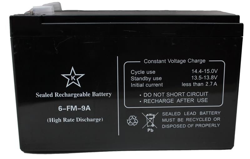 Акумуляторні батареї встраиваются в ИБП і практично не вимагають ніякого обслуговування. KSTAR 12В 9 Ач (6-FM-9) - це батарея з номінальним напругою 12В і емкостью 9 Ач. Також дана батарея характеризується низьким рівнем саморозмірності. Назначення: джерела бесперебойного харчування, централі, охоронні сигналізації.