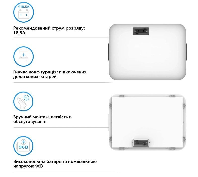 HV9637 – це літій-залізо-фосфатна (LiFePO4) батарея, розроблена з урахуванням усіх сучасних вимог та інновацій у галузі енергопостачання. Номінальна напруга 96 В та номінальна ємність 37 Аг забезпечують високу продуктивність та тривалий термін служби. Ця батарея є невід’ємною частиною модульної системи Dyness Tower, що гарантує надійність та безпеку використання.