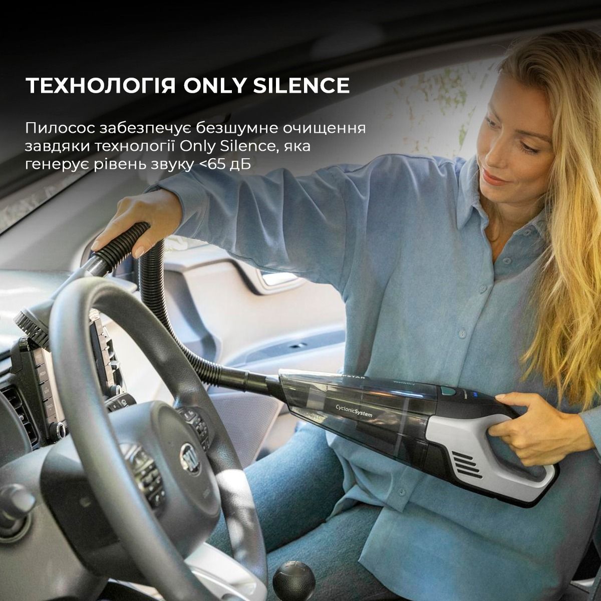 Ручний пилосос без зусиль справляється зі складними забрудненнями завдяки потужності всмоктування до 7,5 кПа. Завдяки циклонному типу мішка висока потужність підтримується протягом усього прибирання. Потужність мотора становить 110 Вт, при цьому пристрій працює практично безшумно, не доставляючи дискомфорту.