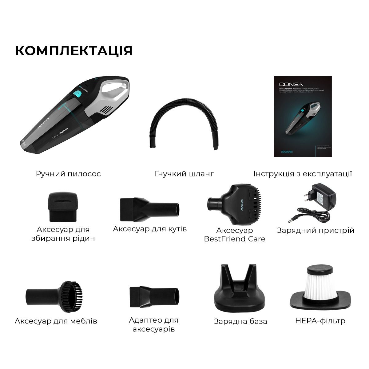 Комплектація: ручний пилосос, аксесуар для рідини, аксесуар для меблів, запасний фільтр, база для зарядки, аксесуар BestFriend Care, зарядний пристрій, аксесуар для куточків, аксесуар для шланга, керівництво користувача