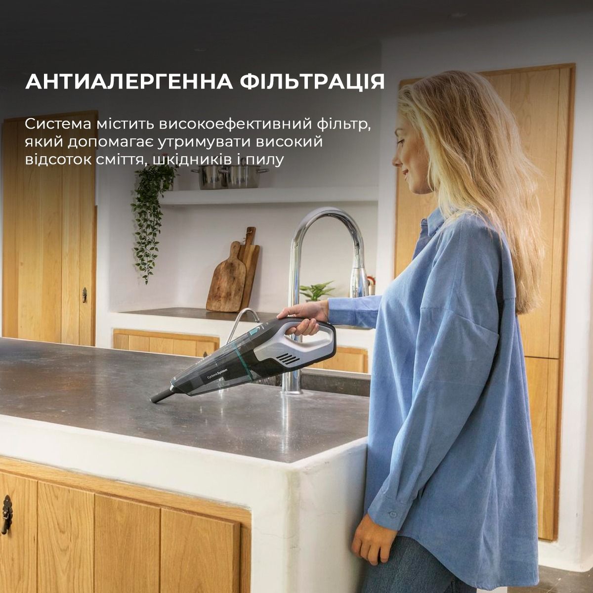 Ручний пилосос оснащений ефективним фільтром очищення, який затримує дрібні частинки, алергени і пилових кліщів. Крім естетичного ефекту прибирання, навколишнє середовище стане більш екологічним.