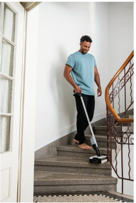 Система з 2 бачками: безперервне зволоження роликових щіток водою з бачка для чистої води і одночасний збір забруднень в бачок для брудної води. Прибирання без великих зусиль: не потрібно переносити відро, протирати підлогу шваброю і вручну віджимати ганчірку. Роликову щітку можна очищати в пральній машині за температури 60 °C.