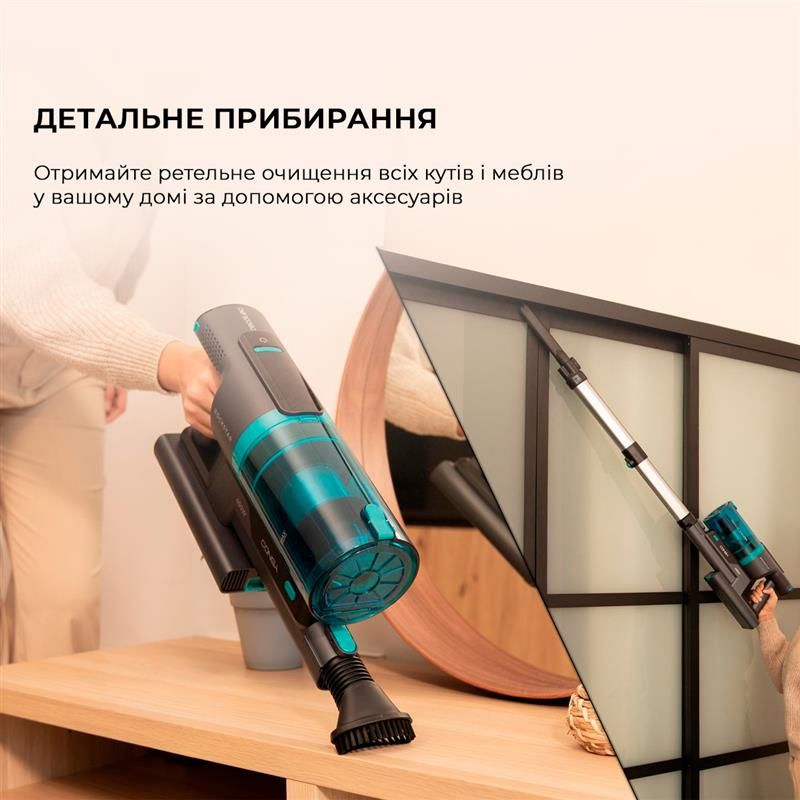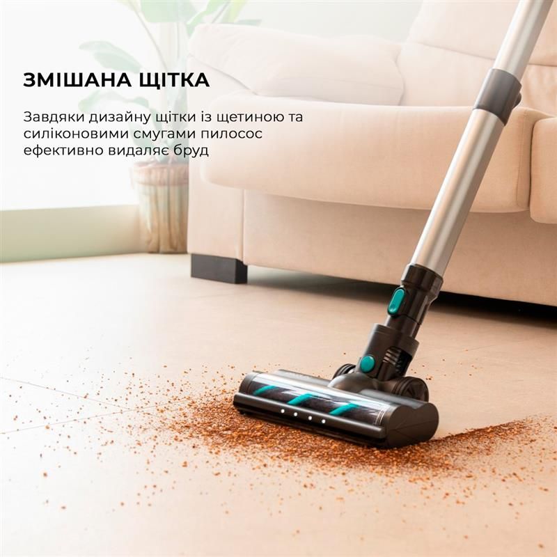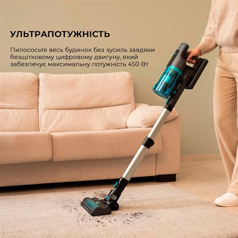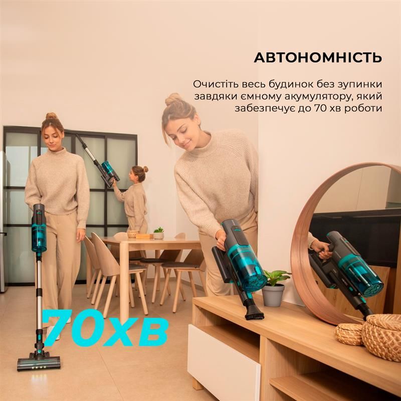 Потужний акумулятор 2500 мАч і напруга 29,6 В забезпечують до 70 хвилин безперервного прибирання, що дозволяє очистити весь будинок без необхідності підзарядки.