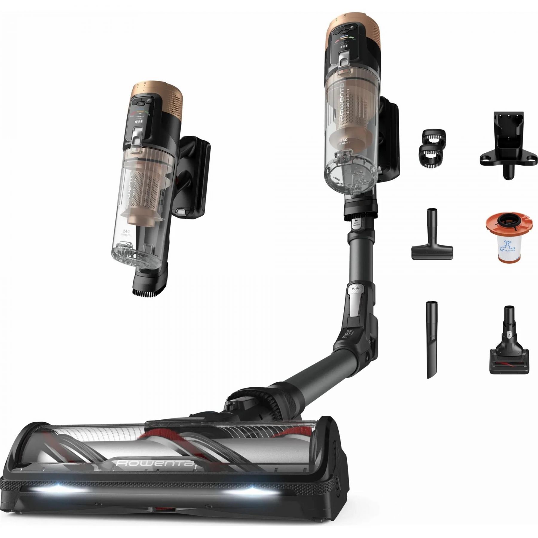 X-Force Flex 14.80, акумуляторний пилосос від Rowenta, забезпечує високу ефективність всмоктування. Акумуляторний пилосос з потужністю всмоктування 240 АВт, обладнаний новітньою щіткою а також автоматичним регулюванням потужності всмоктування для ефективного очищення всіх підлог, особливо килимів.