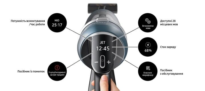 Керуйте та експлуатуйте пилосос інтуїтивно з цифровим рідкокристалічним дисплеєм, що підтримує 28 мов. Одним поглядом ви можете побачити потужність всмоктування і заряд акумулятора, що залишився. Дисплей також сповістить вас про проблеми і запропонує їх вирішення, а під час підзарядки, покаже наскільки акумулятор заряджений.