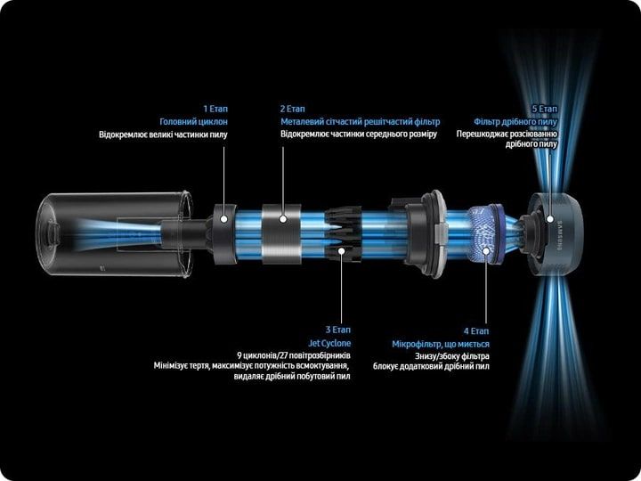 Багаторівнева система фільтрації затримує 99.999% пилу і знижує вплив алергенів тваринного походження. Головний циклонний фільтр і металева решітка затримують великі частинки пилу, Jet Cyclone і мікроволокно вловлюють дрібніший пил, а фільтр дрібного пилу зупиняє мікроскопічні частинки.