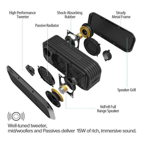Беріть колонку з собою на вечірку на задньому дворі або біля басейну, на спортивні ігри з вашими друзями або на пляж. Voombox-Power повністю задовольнить ваші потреби в музиці. Два шовкових динаміка, два пасивних випромінювача і професійна настройка за допомогою DSP народжують прекрасну музику з глибокими посиленими басами і розширеним діапазоном звукових частот. Завдяки підтримці Bluetooth 4.2 колонка здійснює з'єднання з сумісними пристроями на високій швидкості. Діапазон прийому Voombox-Power - до 10 метрів. Divoom Voombox-Power підтримує зручну технологію NFC, за допомогою якої мобільного пристрою не потрібно створювати пару з акустикою - для старту відтворення досить покласти смартфон на колонку.