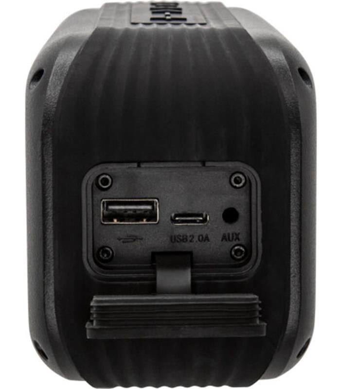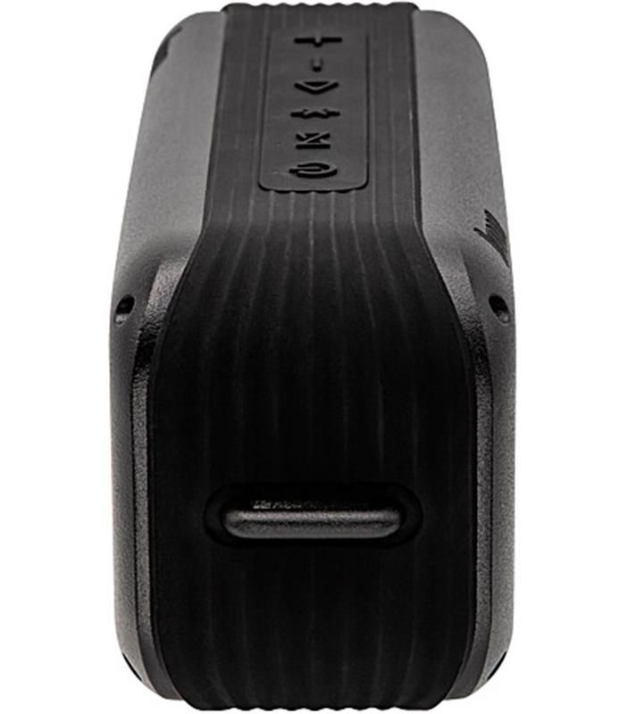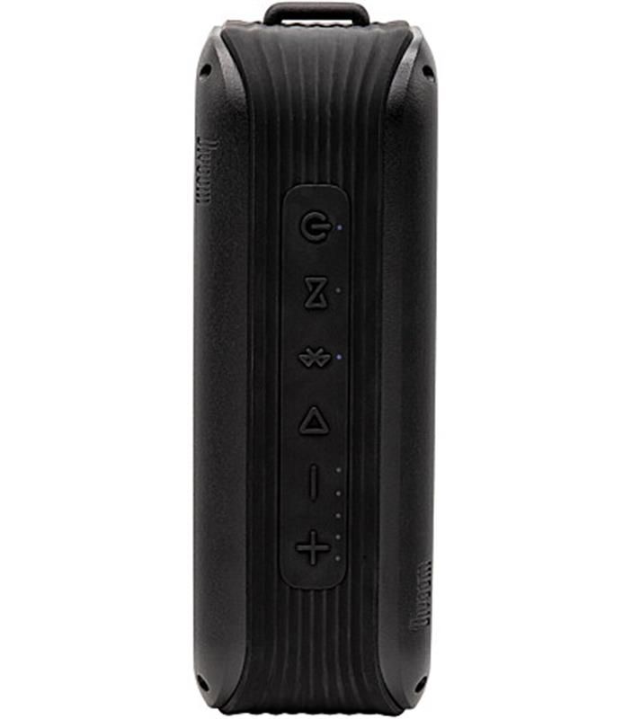 Конструкція корпусу відповідає коефіцієнту водозахисту IPX5: бризки дощу, водойми або басейну не завдадуть шкоди техніці. Будова з використанням металевої основи і гумового захисту стала запорукою міцності. Ремінець для наручного носіння дозволить взяти акустику з собою, а стійка основа – розташувати на будь-якій площині.
